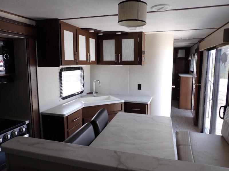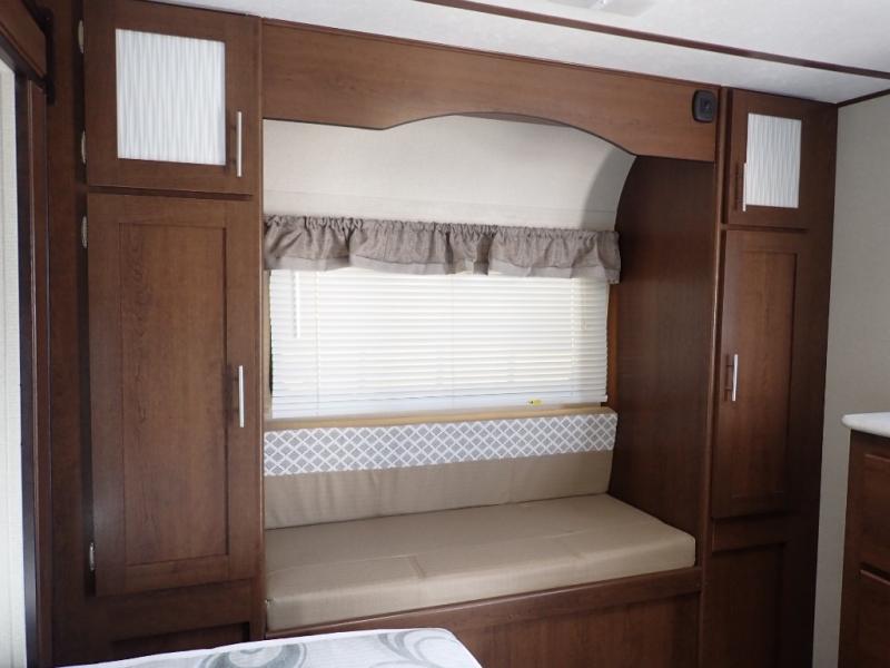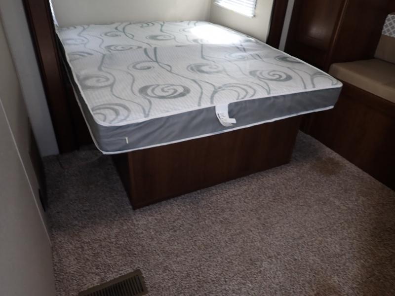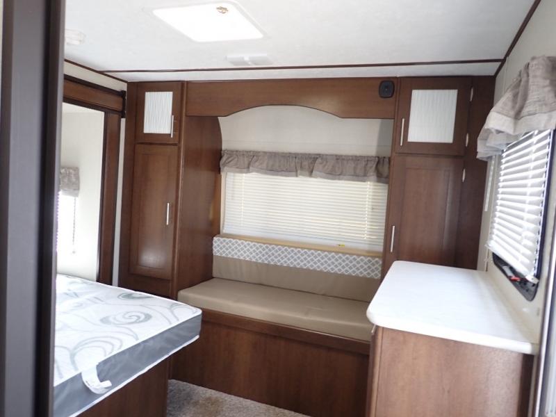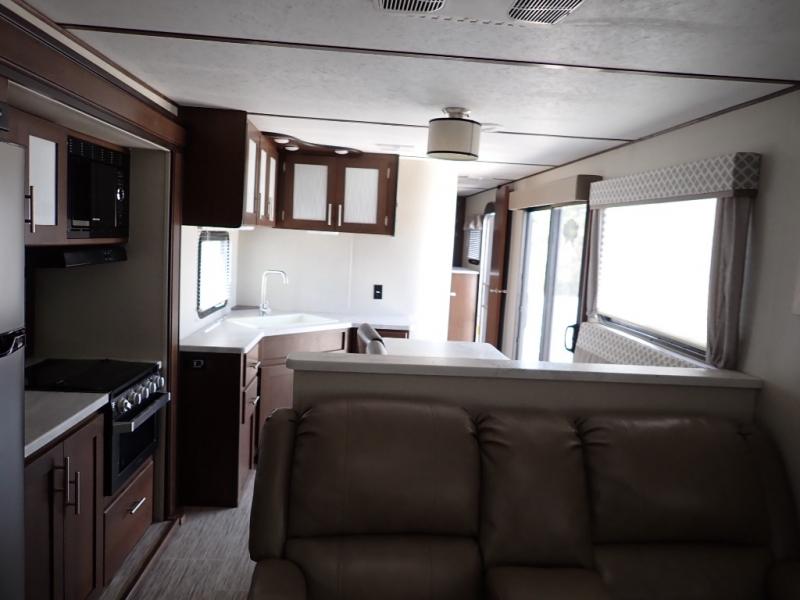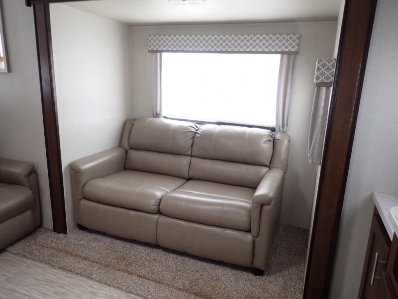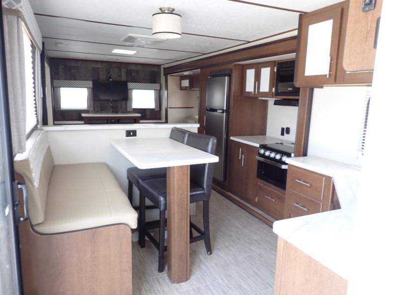 This Avenger travel trailer is perfect for your family of six looking to escape to the outdoors. The front private bedroom includes a bench seat with two wardrobes on either side that mom and dad will love to relax on after a long day. This unit features a rear entertainment area with a hide-a-bed, and a jack knife sofa for the kids or grandparents to sleep on at night. Preparing family dinners in this trailer is easy with a three burner cooktop, plus a microwave, and plenty of counter space. The kids will love to sit at the hi-top dinette that includes a booth seat on one side and two chairs on the other. This model also features a bath with a large shower with a skylight, and a linen closet for extra towels. Come see today why this travel trailer is the one for you!