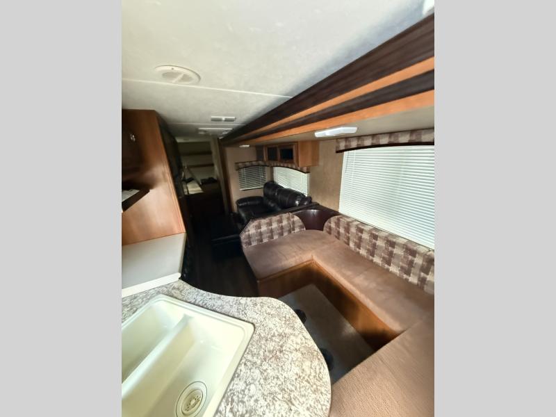 If you are a growing family that enjoys the comforts of home while away exploring at a state park, then you need this Avenger ATI travel trailer. You are sure to enjoy the entertainment center and 50" LED TV, and the outdoor kitchen will be helpful as you visit with other campers and watch your kids play. From the U-shaped dinette and sofa, to the queen-size bed in the private bedroom and double-size bunks, you will have plenty of space to sleep ten people.