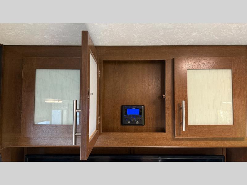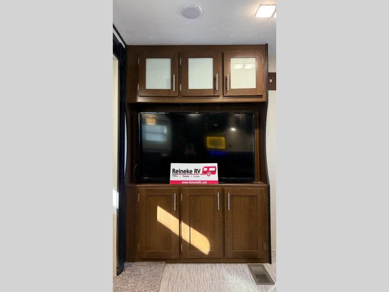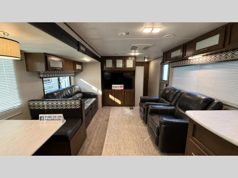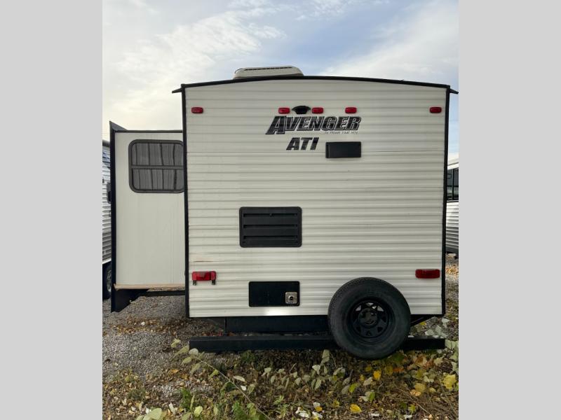 If you are a couple or growing family that enjoys the great outdoors with comforts and conveniences of home, it's time to take a look at this Avenger ATI travel trailer as your family's next RV. Imagine yourself watching the 50" TV from one of the two lounge chairs in the evening or cooking your favorite meal on the three-burner range top in the rear kitchen with pantry for plenty of storage. If you need privacy, slide the bedroom door closed while relaxing on the queen-size bed after grabbing some lounge clothes from the bedroom wardrobes.