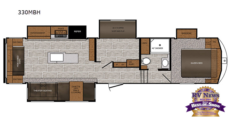 You can see why this Crusader fifth wheel received the Best In Show reward by RV News! Mom and dad will appreciate their own space with a private front bedroom that includes a wardrobe and night stands on both sides of the bed. With a second bedroom in this unit, that includes a 38" x 74" bunk with an area to play underneath, the kids will have a place to call their own. This unit features theater seating to enjoy an evening movie with your spouse. You'll love the kitchen in this fifth wheel that includes a deep, single bowl stainless steel sink, and a kitchen island for meal prepping. This model also includes a hide-a-bed sofa, and plenty of overhead storage compartments for all your valuables!