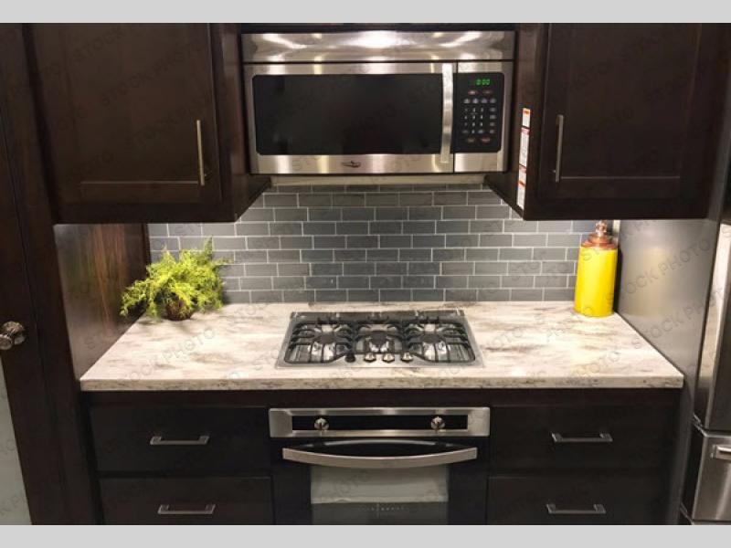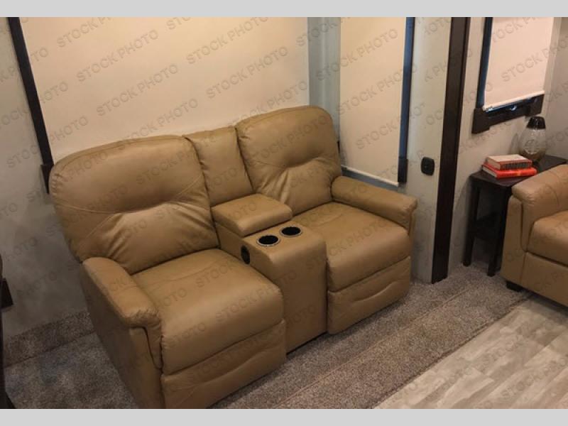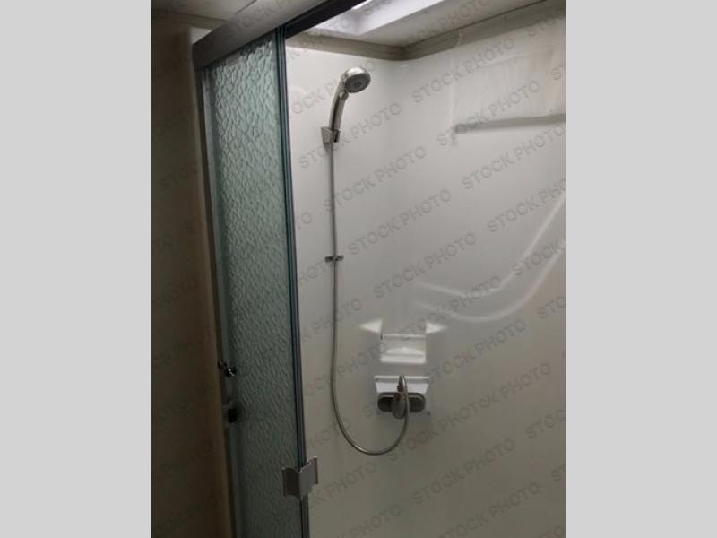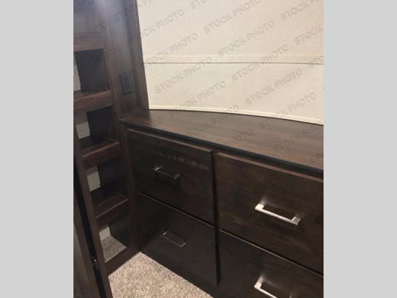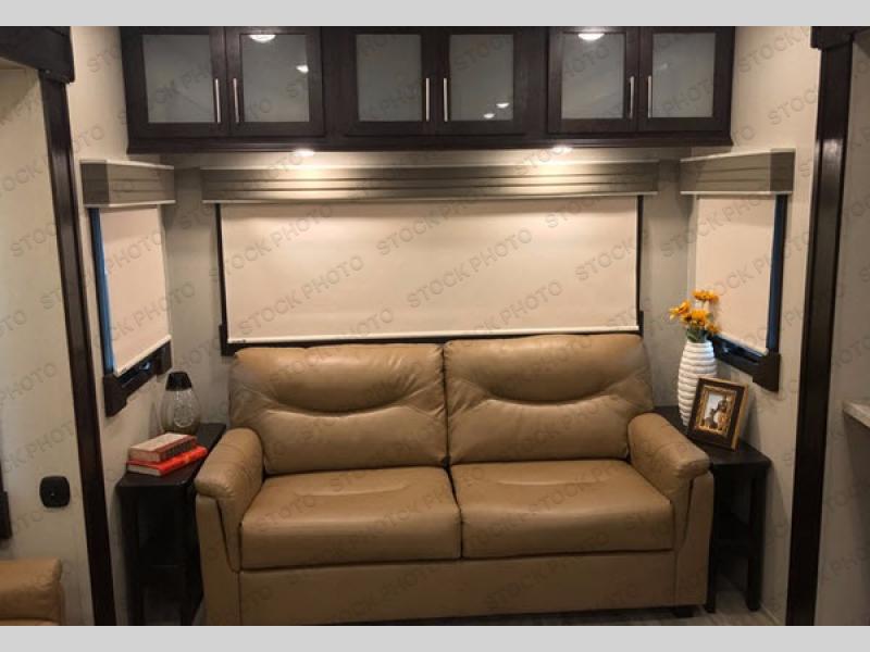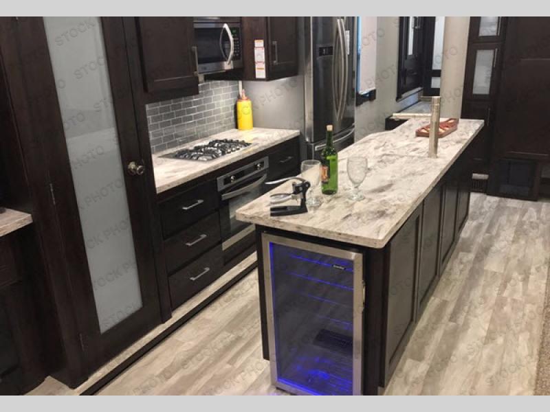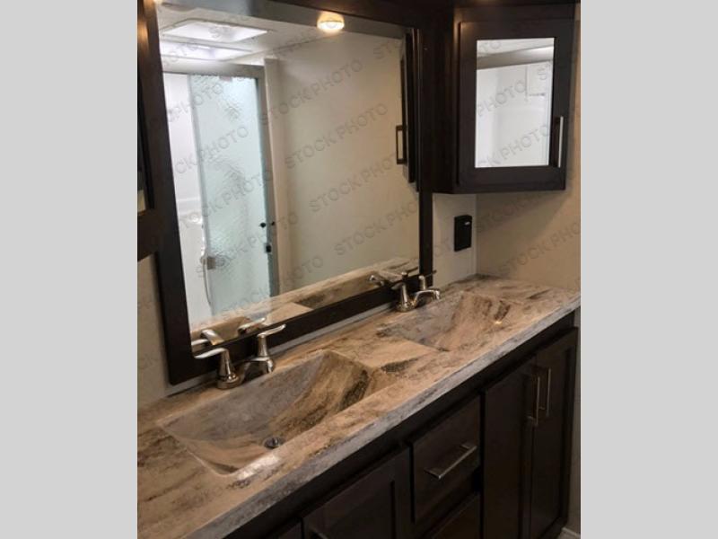Comfort, luxury, and relaxation come to mind when entering this Sanibel fifth wheel 3651. Inside you will appreciate the dual sinks in the heated bathroom allowing more space for everyone to get ready for the day, including the 48" shower with "Stor Mor" shower caddy. When it's time to cook, the kitchen island provides plenty of counter space, a stainless steel sink with an extra deep bowl, and a residential refrigerator allowing you to stock up on all your favorite cold items. There is plenty of residential style seating, a king size I-Rest mattress, and a washer/dryer prepped space, plus more!