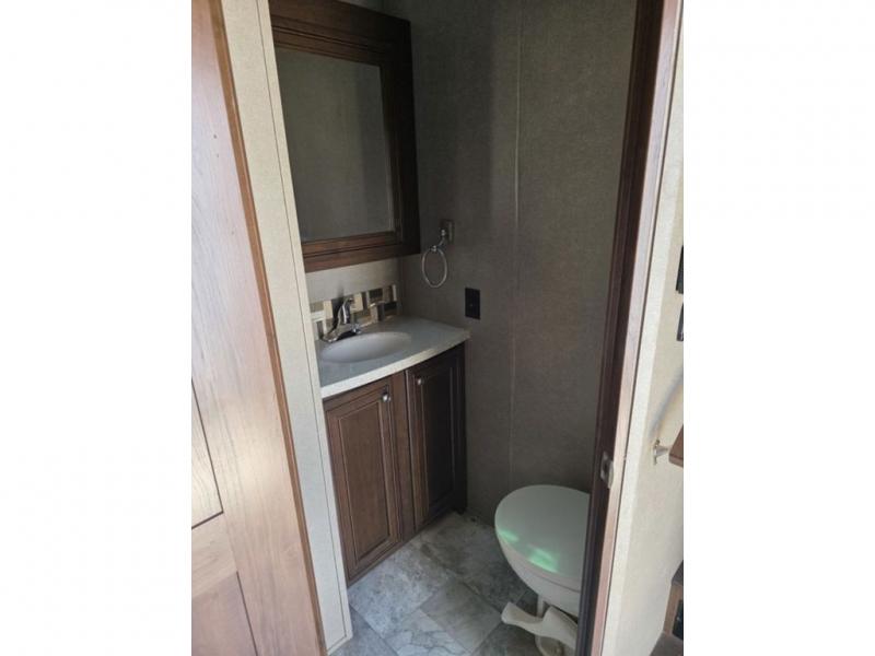 You will love all of the amenities in this Redwood fifth wheel, from the bath and a half that is super convenient for your family, to the comfortable rear living area with a 55" TV. You'll love the kitchen with residential appliances as well as an island for easy meal prep. When you are ready to relax for a bit in the evening, kick back on the theater seats or the 80" sofa. This unit features a front bedroom that includes a full bath with a double sink vanity, a 39" TV, and a large walk-in closet with a stacked washer and dryer! This fifth wheel has everything you need for your next journey!