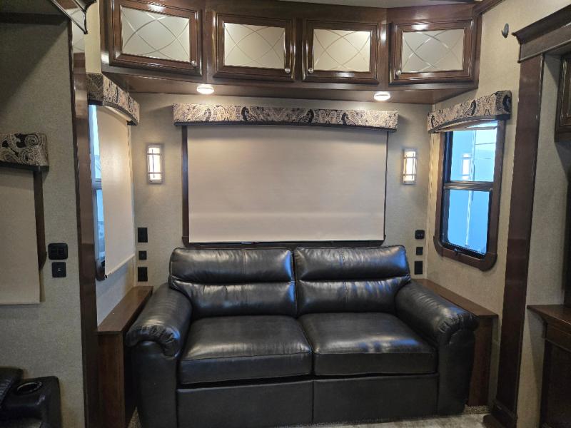 This Redwood fifth wheel is perfect for your next camping trip with family. With a front master bath and closet that includes a vanity with two sinks, you'll feel right at home. After a long day, stretch out on the spacious king bed and watch a movie on the 39" TV. The kids will love the rear living area that features a sofa and theater seating, plus a 55" TV for morning cartoons. This unit includes a kitchen with a wet bar and a wine cooler for the adults to enjoy. With multiple overhead storage compartments in this model, you can bring all the comforts of home with you. Check out this fifth wheel today and you'll be happy you did!