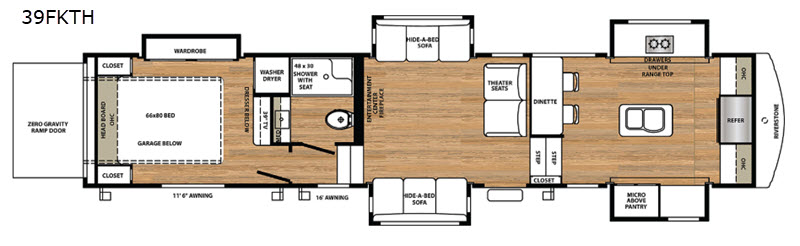 This RiverStone 39FKTH toy hauler fifth wheel gives you all of the at-home comforts plus the convenience of bringing along a few dirt bikes or a four wheeler. Whether you are traveling near or far you can easily load an unload your big toys with the zero gravity ramp door. After you are done playing outside for the day then come relax in the living area where you will find two hide-a-bed sofas and a set of theater seats. You can warm up at the fireplace or enjoy watching a movie or show at the 60" LED Smart TV with a premium soundbar and DVD player/stereo. In the front kitchen you will find plenty of counter space for meal prep as well as an island with a double sink and a dishwasher for cleanup to be a breeze!