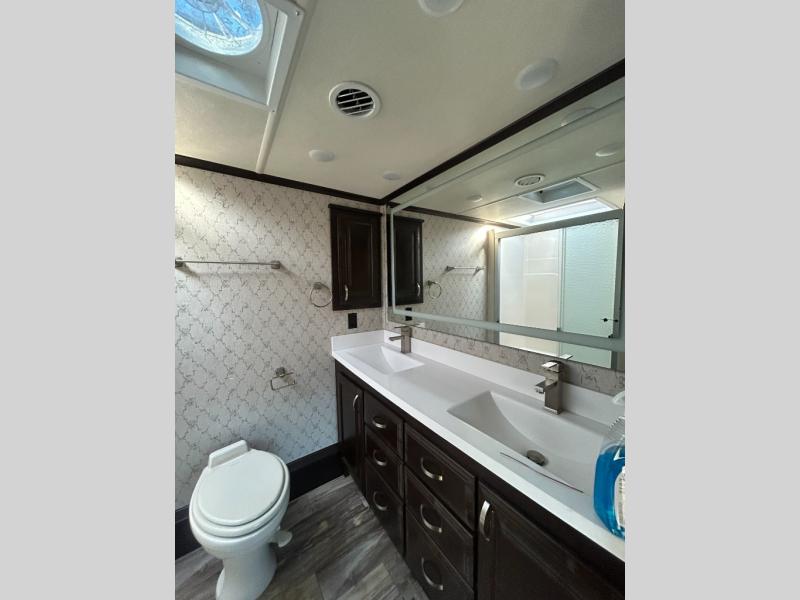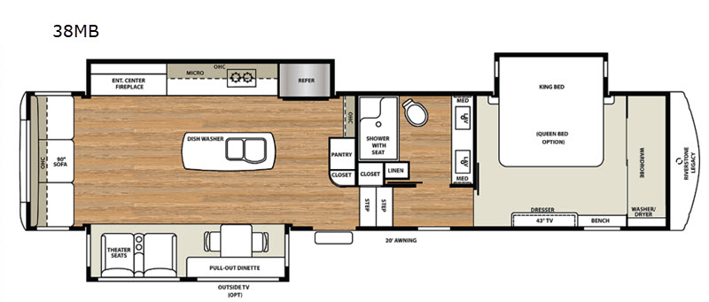 From its industry-leading maximum basement storage to its exceptionally large 20 cubic foot French door refrigerator, the RiverStone Legacy fifth wheel will undoubtedly deliver plenty of space and style! The fully enclosed underbelly and 12V heated tank pads are what allow the Legacy to travel year round, and with the 40,000 BTU furnace that has been installed, you will always feel warm and comfortable inside as you camp out during the cooler months. You also won't have to worry about finding a hot shower when you travel to secluded destinations because the continuous hot water system will provide hot water whenever you need it, and the Dyson cordless vacuum will be immensely helpful as you clean up stray crumbs from dinner or tidy up after a night of entertaining.