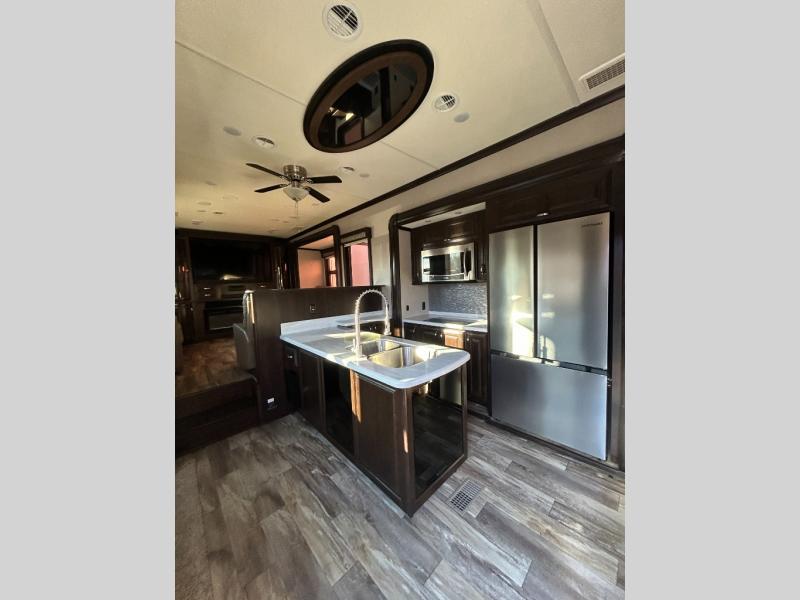 For an unforgettable family outing, look to this RiverStone Legacy fifth wheel to make it happen. As you explore the great outdoors during the day, you will be happy to have such a relaxing atmosphere to come home to each night. The living area will be your favorite place to kick off your shoes and put your feet up with its 90" sofa, theater seats, pull-out dinette, 60" Smart TV, and fireplace. As you prepare dinner for the family, you will appreciate having lots of countertop space, and the double sink on the kitchen island will come in handy as you clean up afterwards.