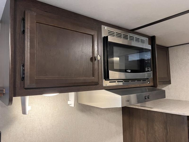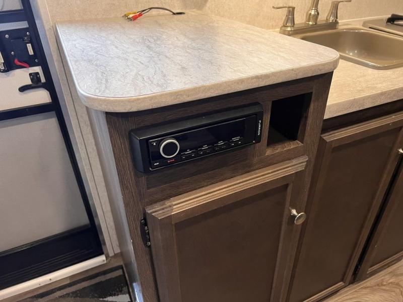 Enjoying a shower after a hunt or fishing outing can be refreshing before bedtime. The kids can then choose their bunk for the night while you sleep on the front bed, and one more person can sleep on the dinette if needed. The slide out dinette also offers more floor space to move around, and a place to play cards if its raining outside. The cook can make any meal in the full kitchen, and you can store your gear in the exterior compartments or in several locations inside. Someone might even choose to relax under the power awning with LED lights and speakers before calling it a night.