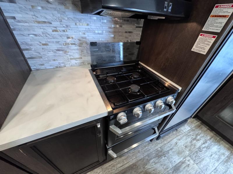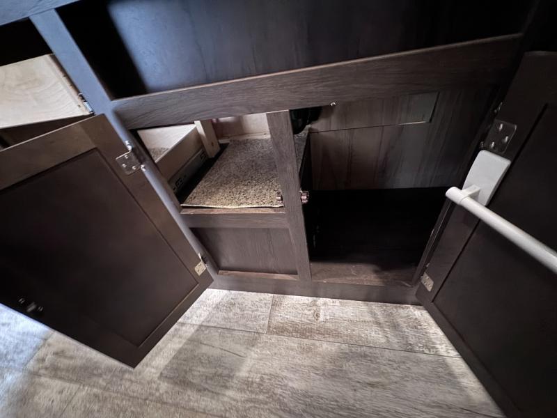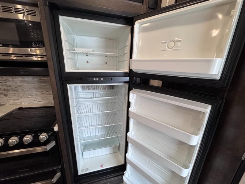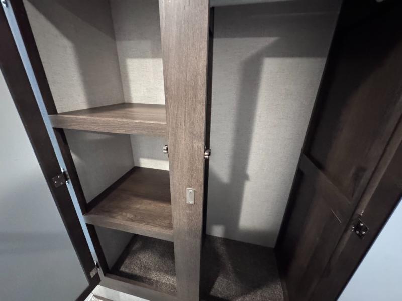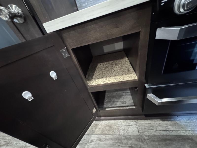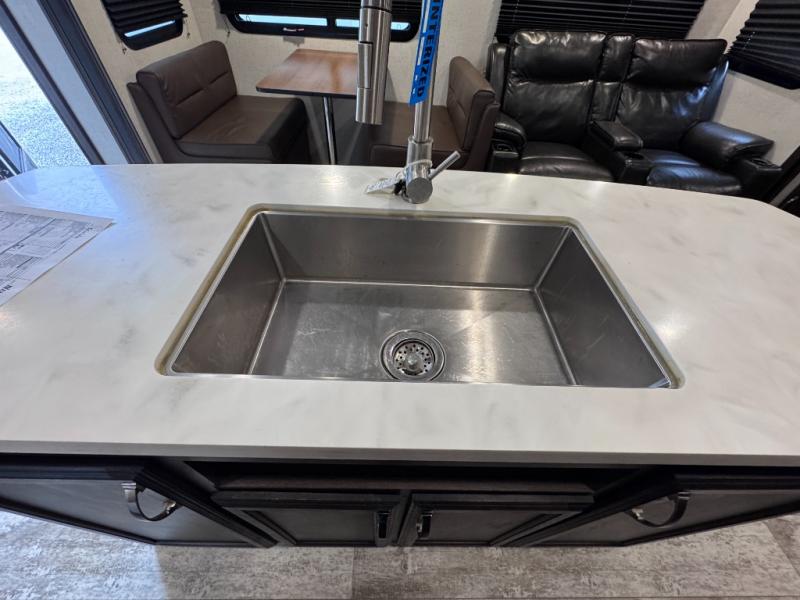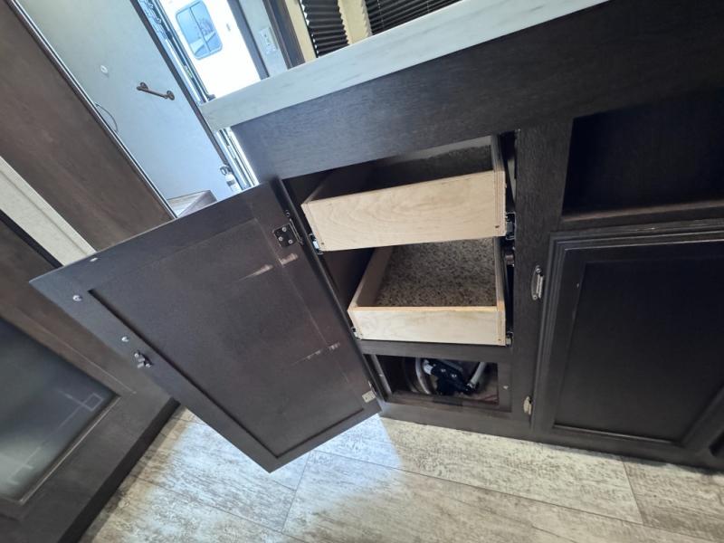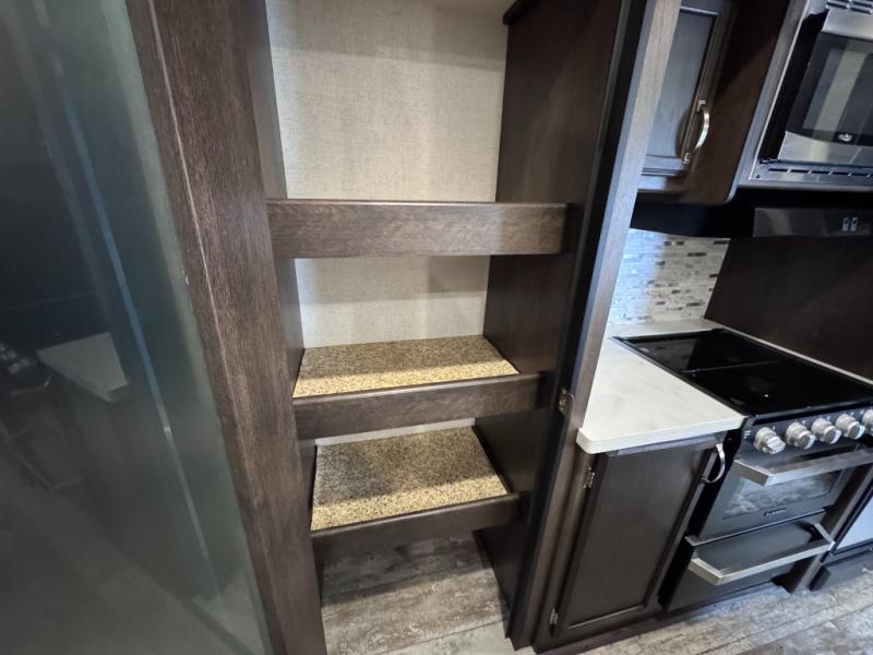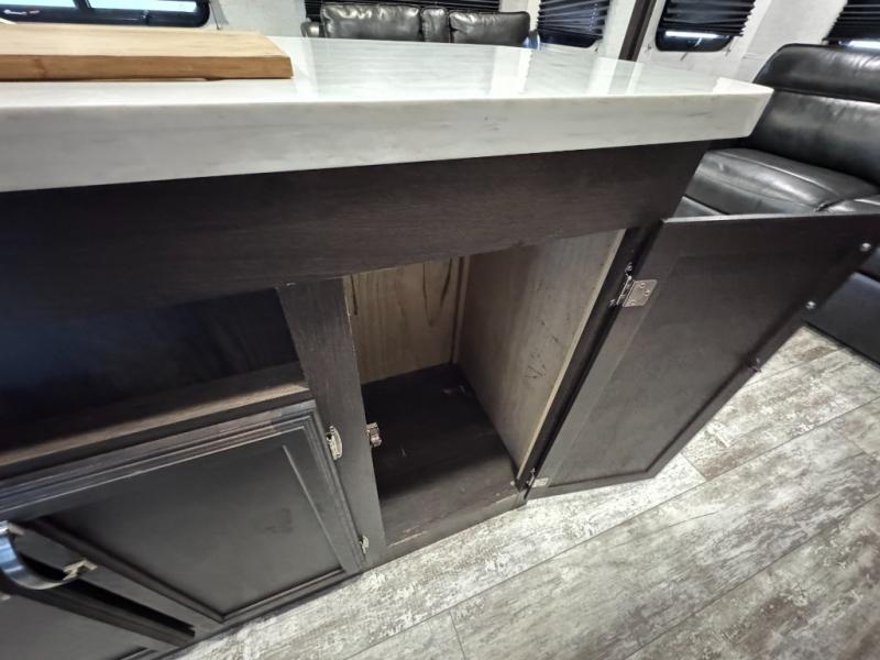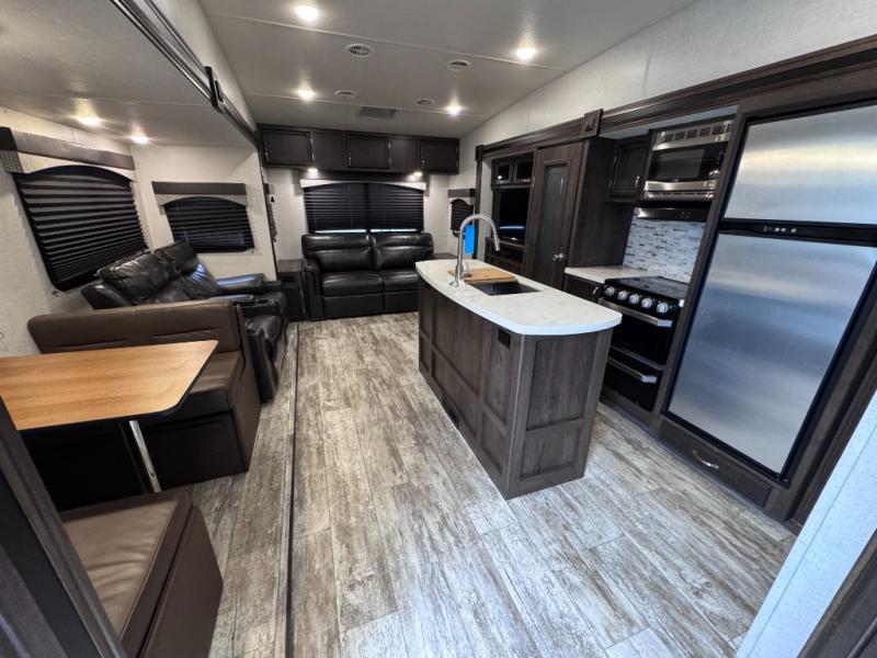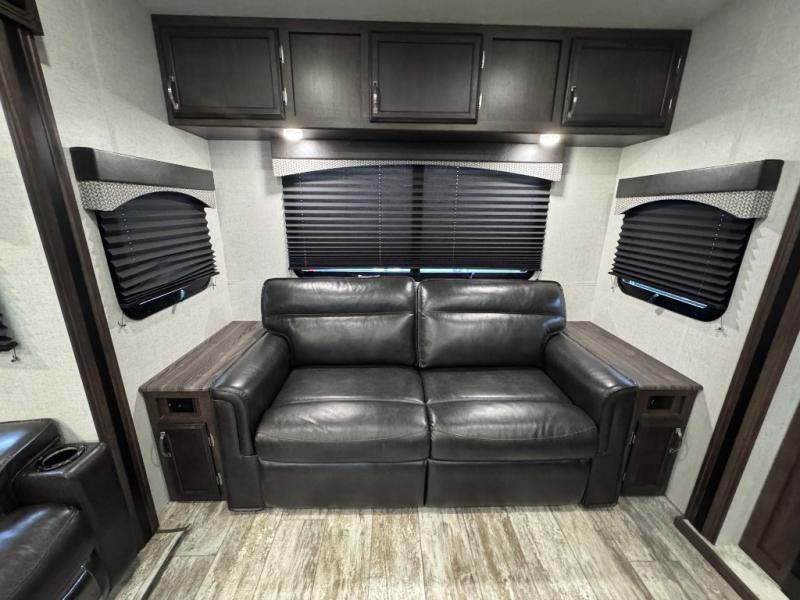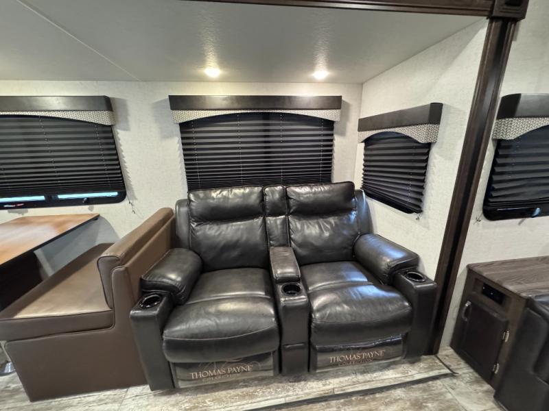 Take a look at this Telluride fifth wheel if you and your small family want to camp in luxury! After a day of making memories in the great outdoors, you can return to full kitchen and bath amenities and entertain other campers in the living and kitchen area with opposing slides. You can watch the LED HDTV while relaxing on the sofa or the theater seats with heat and massage. You will have plenty of storage for your non-perishables in the two pantries and extra serving space on the kitchen island. If you decide to have overnight guests, the sofa and booth dinette provide those accommodations.