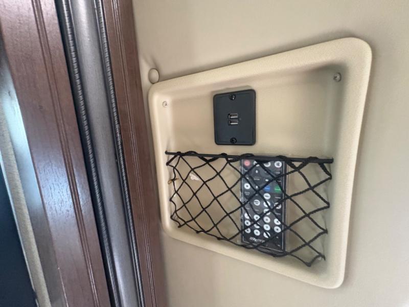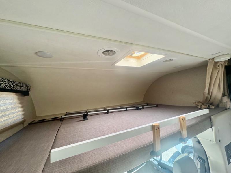 To the left of the entry door there is a flip-up counter top, a 32" LED TV, a double sink, overhead cabinets, a three burner range, a microwave, and a refrigerator. Above the cab there is a cab-over bunk with a sleeping space of 52"x87", plus overhead cabinets.