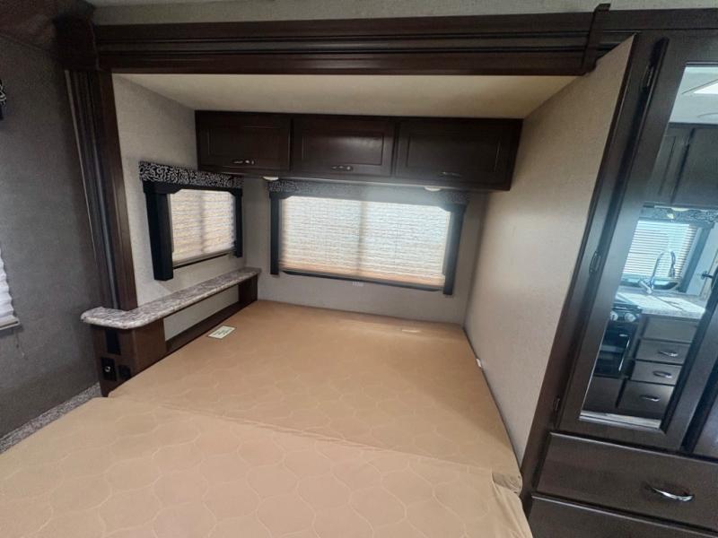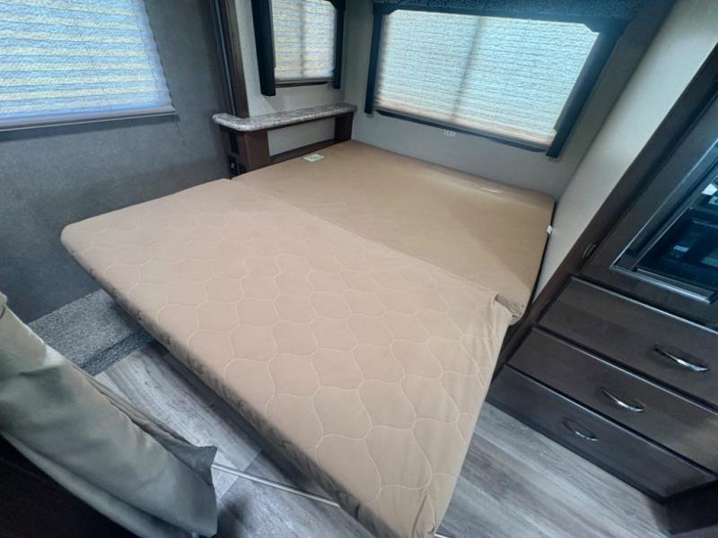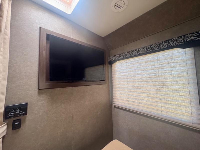 As you continue into the bedroom you will find that there is a privacy curtain, a 32" LED TV, plus the slide out mentioned above continues into the bedroom and features a queen bed with an overhead cabinet.