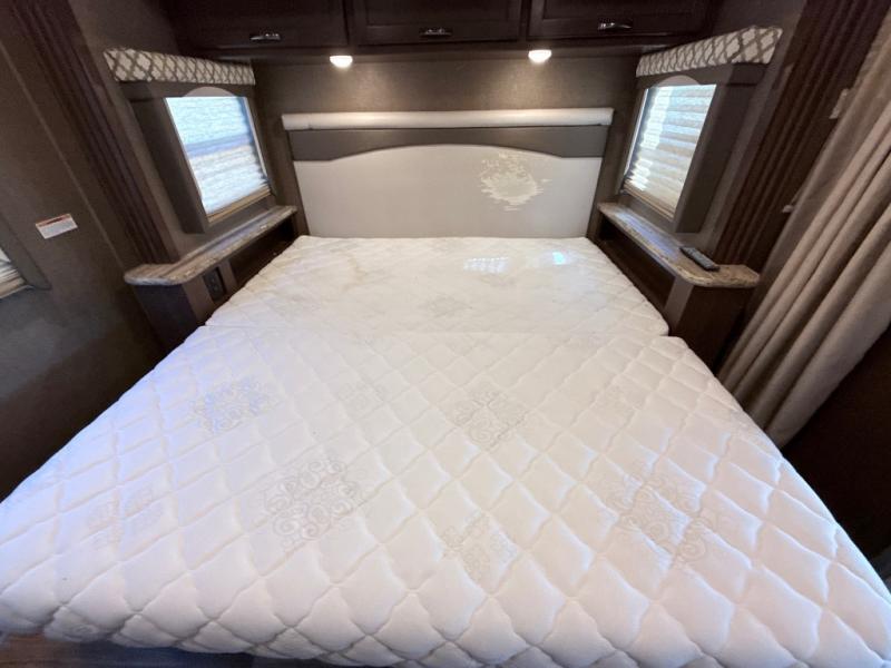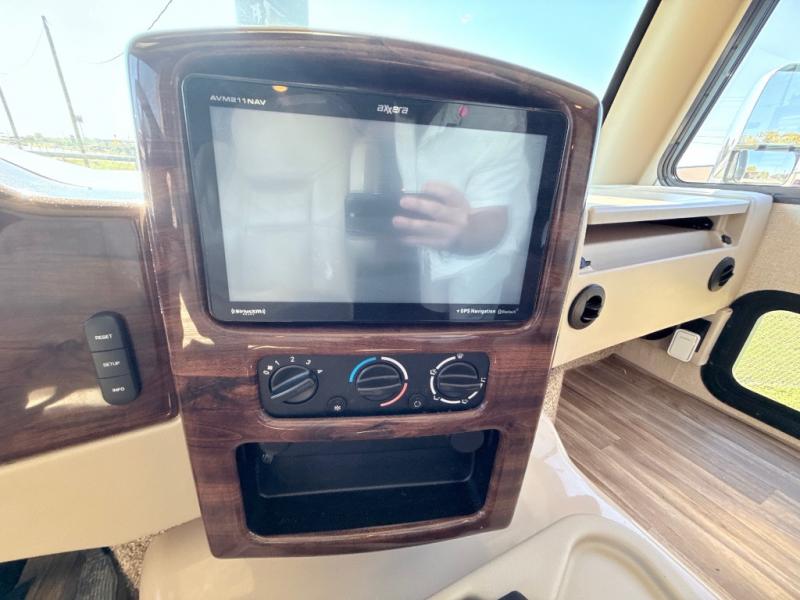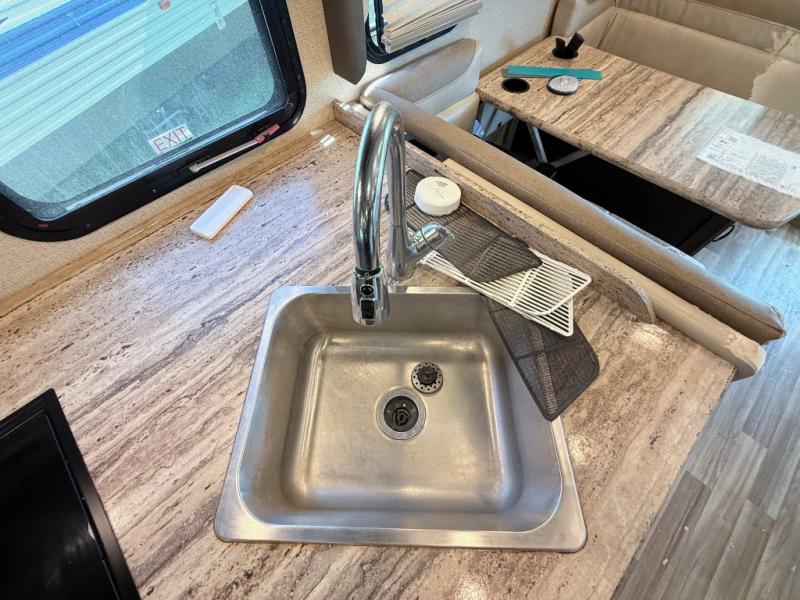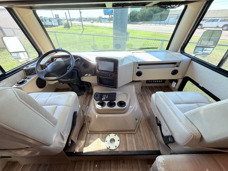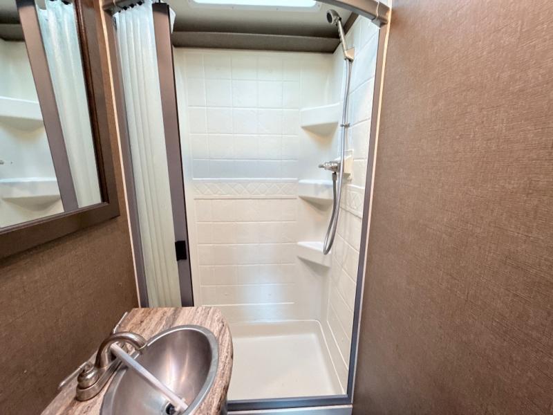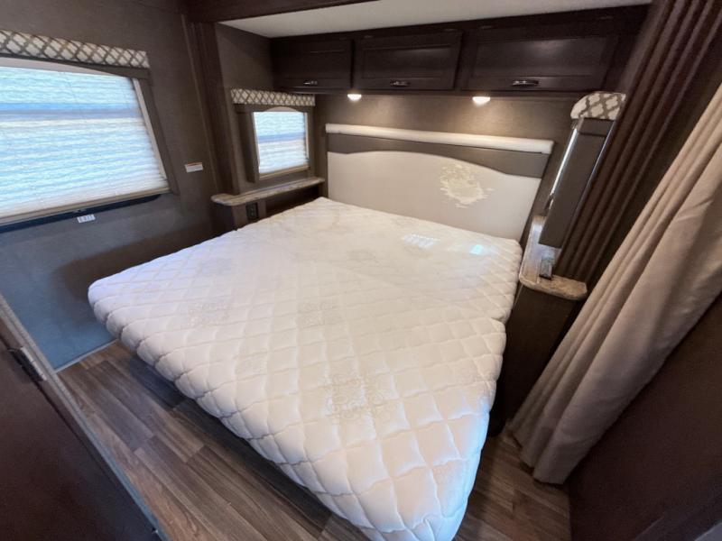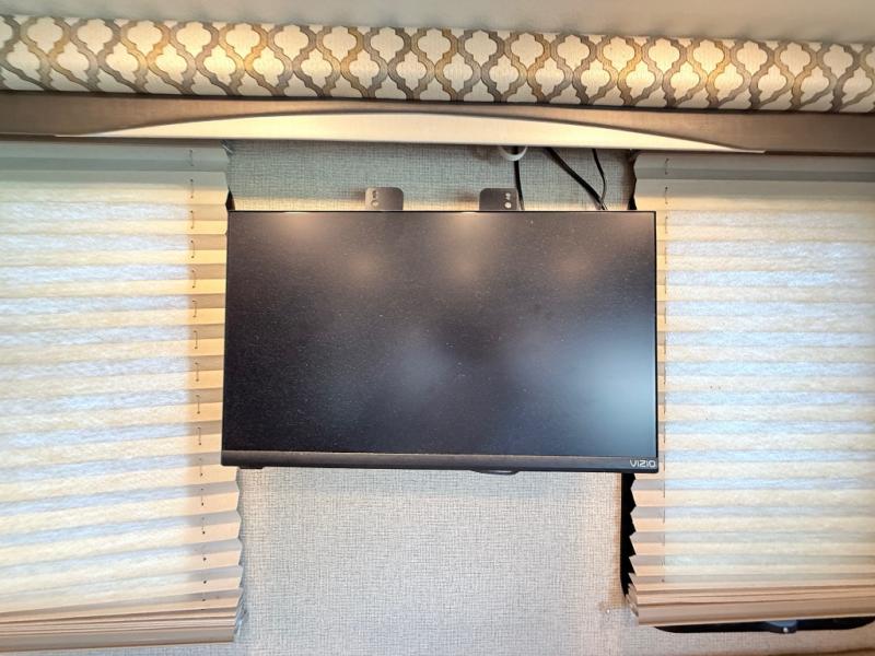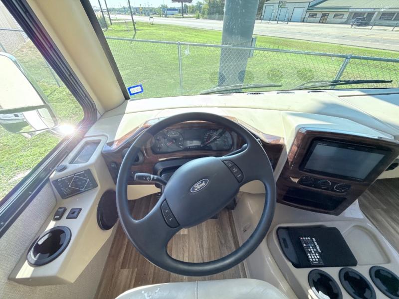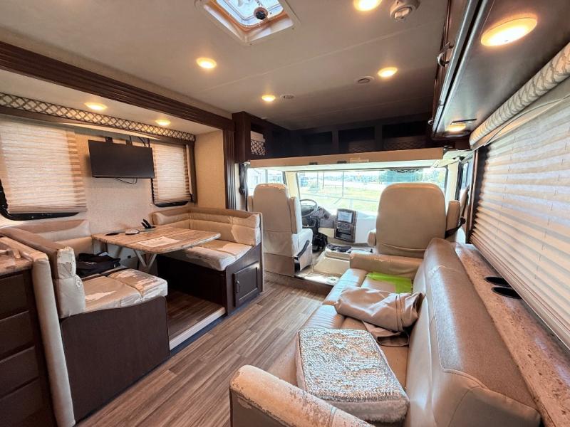 Searching for the perfect Class A motorhome to take across the country to explore new sites and try new activities all while putting in a few work hours? Just imagine drinking your morning cup of coffee in the captain's chairs while placing your book on the stow-away coffee table. You might even choose to complete some work at the dash workstation with 110V and 12V outlets while your spouse takes a walk around the RV park. When it's time to make breakfast, you will find full kitchen amenities, plus you can watch the 40" LED TV while dining or relaxing after cooking. You will also find your own king-size bed and a full bathroom, plus extra sleeping space for overnight guests.