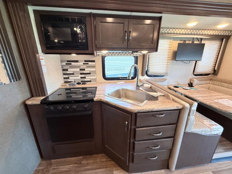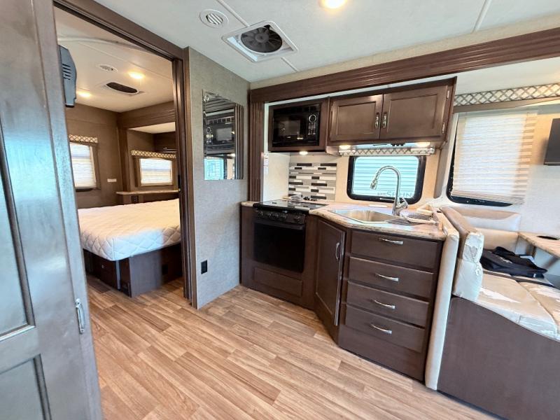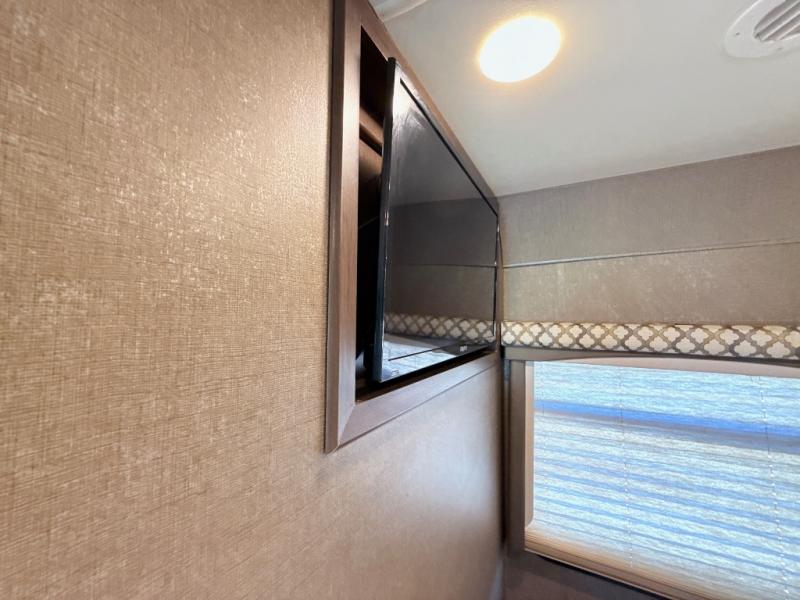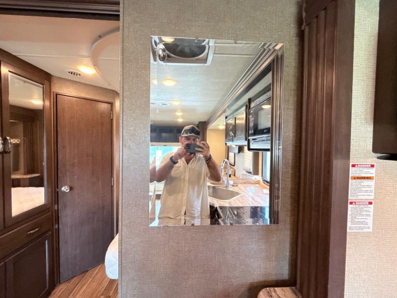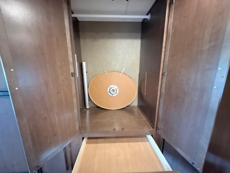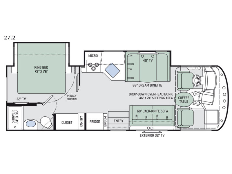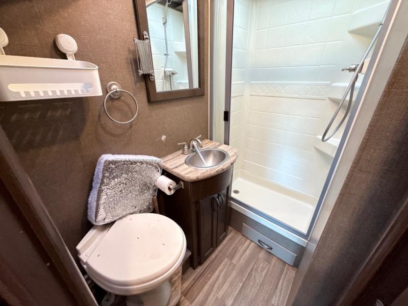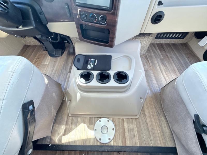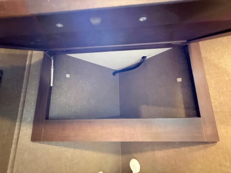 Searching for the perfect Class A motorhome to take across the country to explore new sites and try new activities all while putting in a few work hours? Just imagine drinking your morning cup of coffee in the captain's chairs while placing your book on the stow-away coffee table. You might even choose to complete some work at the dash workstation with 110V and 12V outlets while your spouse takes a walk around the RV park. When it's time to make breakfast, you will find full kitchen amenities, plus you can watch the 40" LED TV while dining or relaxing after cooking. You will also find your own king-size bed and a full bathroom, plus extra sleeping space for overnight guests.