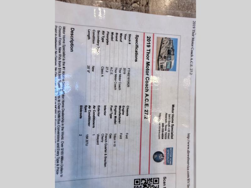 Used 2019 Thor Motor Coach ACE 27.2 Motor Home Class A