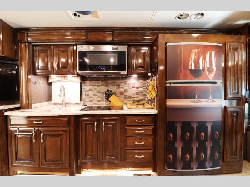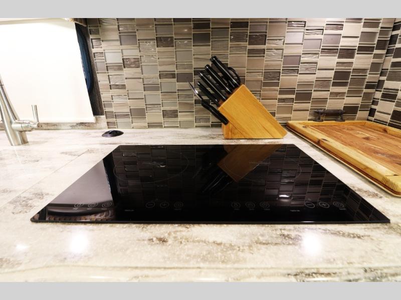 Full kitchen: residential-size fridge, induction cooktop, convection microwave, solid-surface counters, pop-up outlets & tile backsplash
