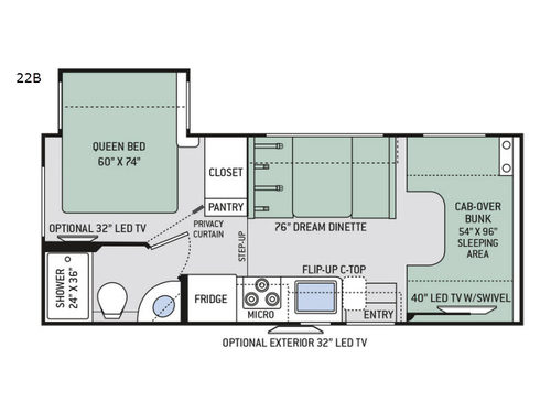 This Four Winds coach is a great Class C motorhome for you to take on any road trip! With a rear bath layout, a single slide out for added space, and your choice of chassis and engine, you will quickly see the benefits this unit has to offer. After you are set up at your destination, head inside to enjoy the interior comforts. Here you will find a 76" Dream Dinette which can convert into additional sleeping space, a 54" x 96" bunk over the cab, and a queen-size bed in the rear private bedroom. When you want to unwind for the day, you will love being able to watch your favorite program on the 40" TV above the cab!