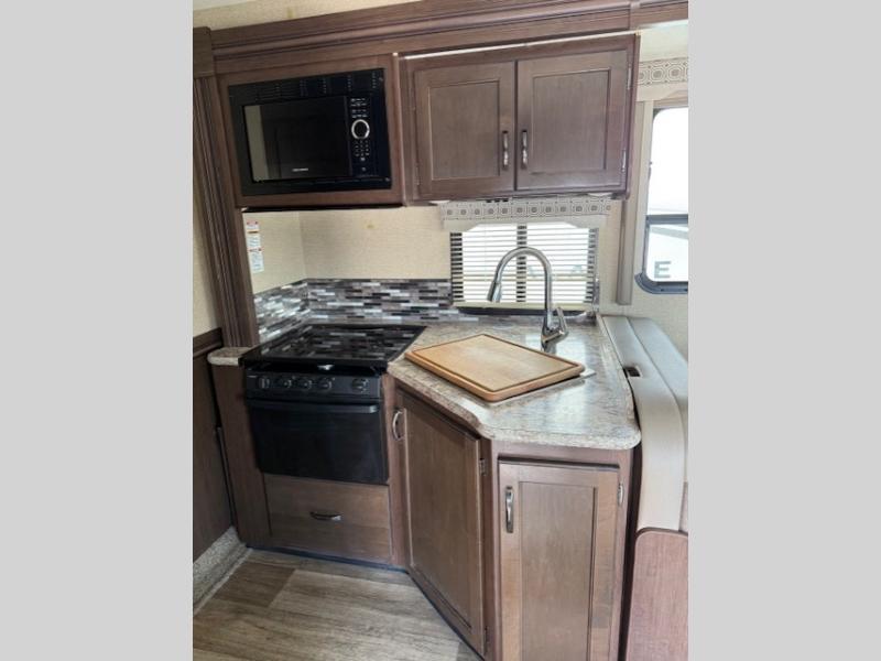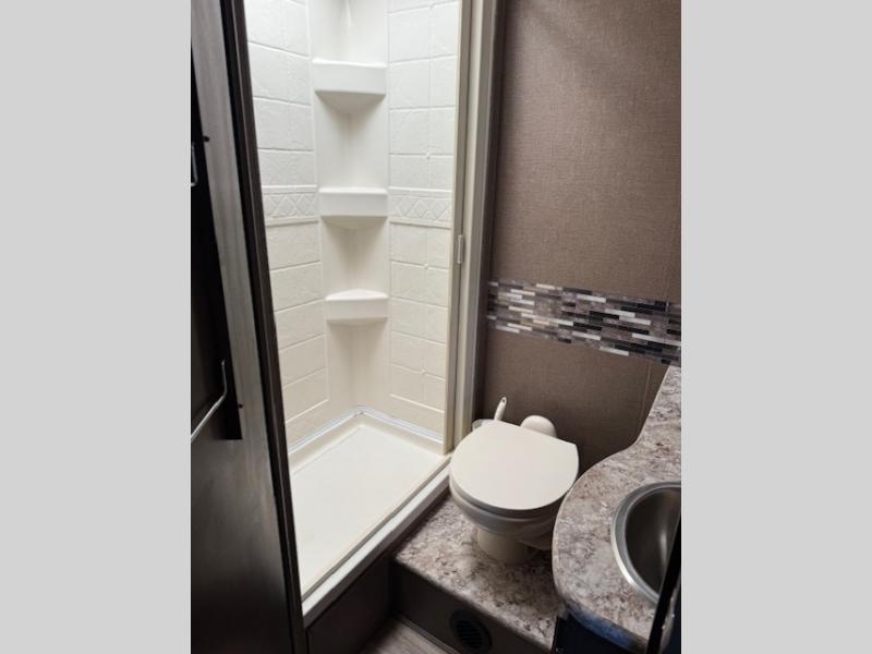 With any Four Winds Class C gas motorhome, you will enjoy the ease of driving and the affordable price. On the interior you will find residential vinyl flooring, high-sheen cabinetry with nickel finish hardware, and laminate countertops which make it easy to clean after a weekend getaway or an extended vacation. The stainless steel bathroom sink and foot flush porcelain toilet provide added convenience every where you stop, and the skylight above the shower is an exceptional feature that brings in the morning sunlight and brightens up the interior.