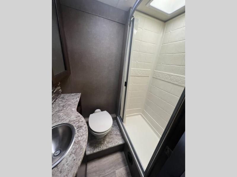 Heading toward the rear of this unit, the bathroom is along the right side. Here there is a 24"x36" shower, toilet, sink, and overhead cabinet.
