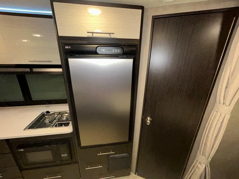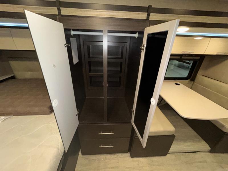 Get ready to set out to new destinations in a Gemini Class C diesel motorhome. Along the exterior portion of the Gemini you will find a Vacu-Bond laminated roof, walls, and floors with block foam insulation. Your extra camping gear can be stored in the Rotocast storage compartments with lights, and there is a power patio awning with integrated LED lights which will allow you to sit outside just a bit longer each night. The interior decor of the Gemini has a modern and classy look with its residential vinyl flooring, Euro-style cabinet doors, and pressed laminate countertops.