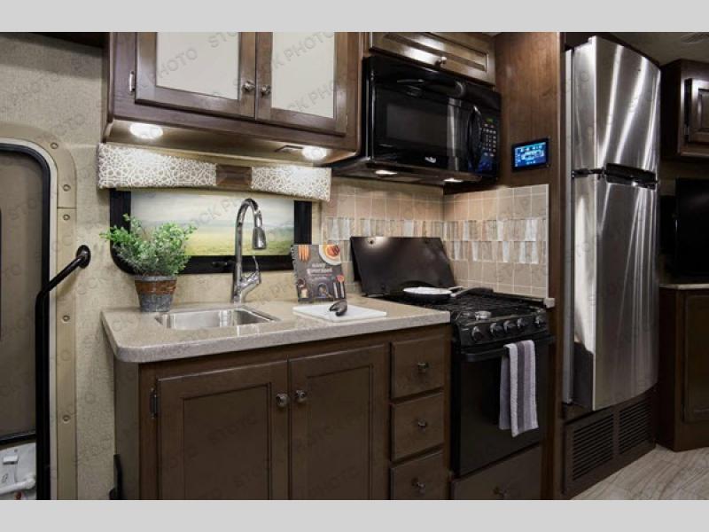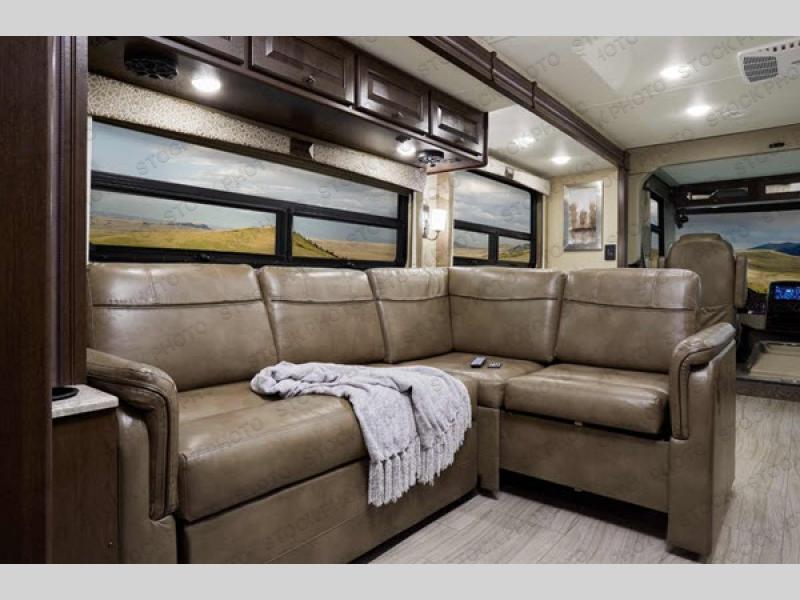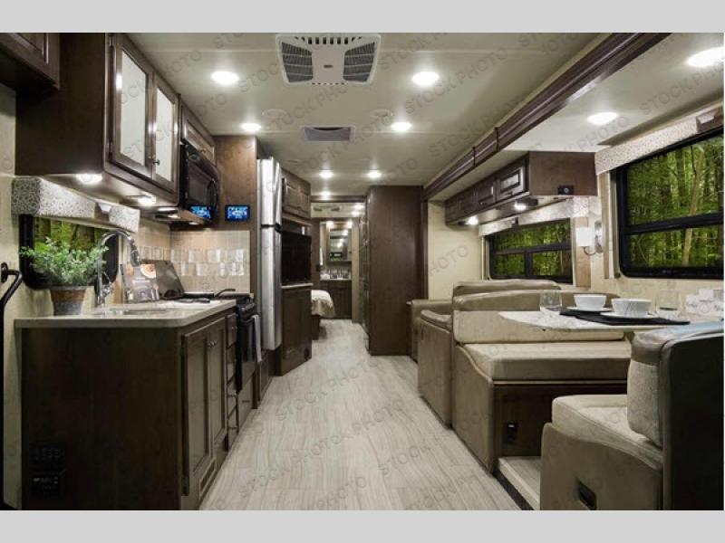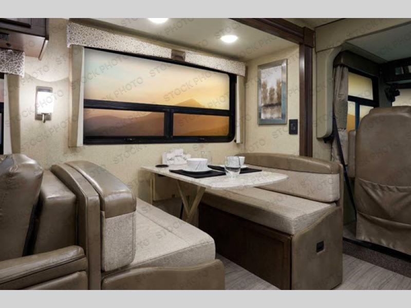 You will find there is much to love about the Windsport class A gas coaches, whether you are out for a long road trip across the country, or a weekend reunion with family. All Windsport models feature Leatherette furniture, solid surface kitchen countertops, and raised panel upper cabinet doors with nickel finish hardware and glass inserts on select doors. With the swivel and reclining captain's chairs featured in these coaches, you can easily bring them into the conversation area in the living space once parked. Each unit includes a dash workstation with 110-volt and 12-volt outlets at the passenger side for those who need to take work with them on the road, or for those who just enjoy surfing the internet. On the outside, enjoy Robocast storage compartments, an outdoor shower, and a legless lateral power awning with integrated LED lighting. Make any Windsport class A gas coach by Thor Motor Coach your new home-away-from-home today!