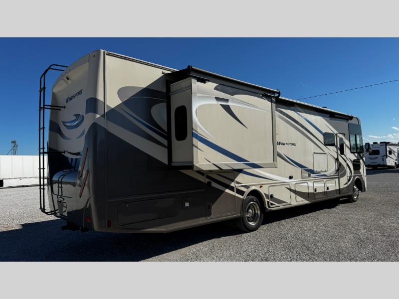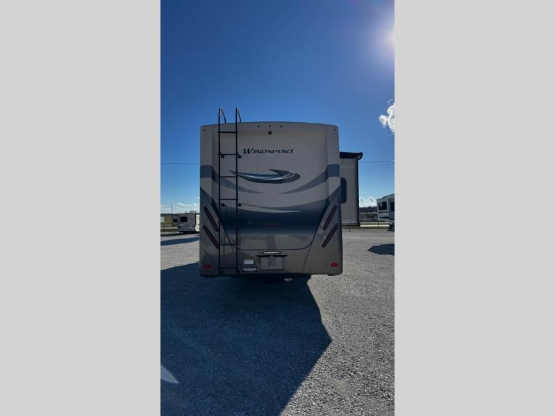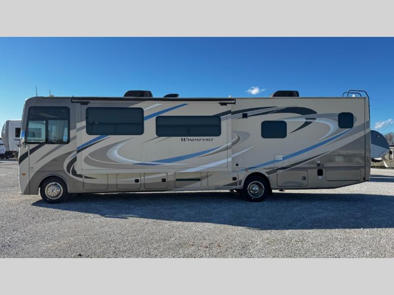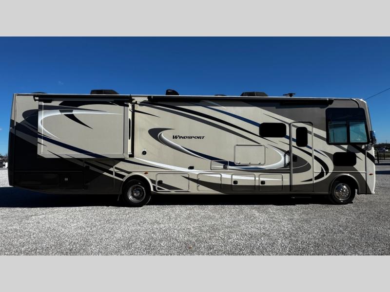 Have you been searching for the perfect RV to travel to see family and friends? This Windsport class A gasoline coach will fit all your requirements. With a spacious living area and bedroom, two slide outs, and comfortable accommodations for everyone, you will enjoy this RV for years to come. The captain's chairs swivel to face the main living area once in park providing more seating to visit. Your friends and family will enjoy the expanding sofa bed and Dream dinette while relaxing, plus there are seat belts for your passengers. The cook will appreciate having a full kitchen to make meals when you don't want to get fast food. The owners will have a master bedroom with king size Denver mattress all to themselves, while everyone else sleeps on the furniture once folded down for the evening or on the drop down overhead bunk. You have the convenience of a full bathroom in the rear of the unit, and a half bath in the living area. There are many more features and options to choose from when you pick this model!