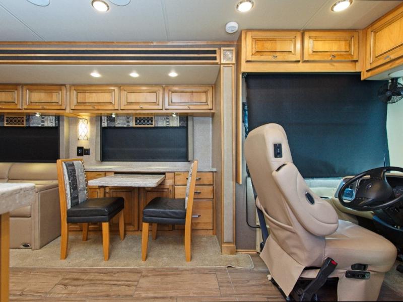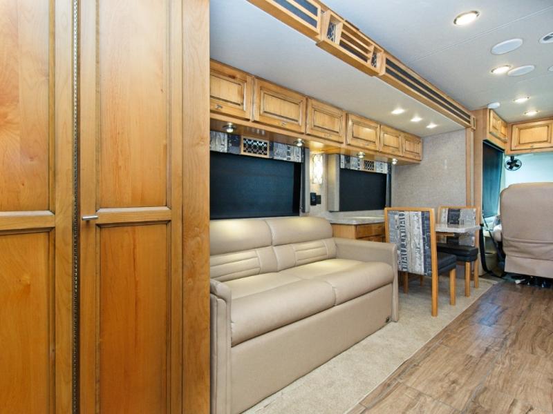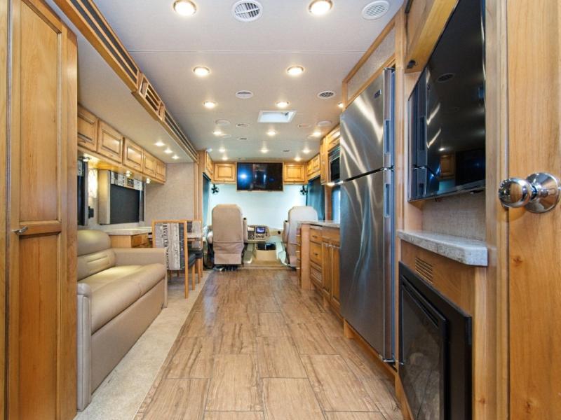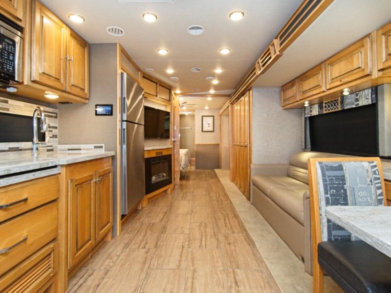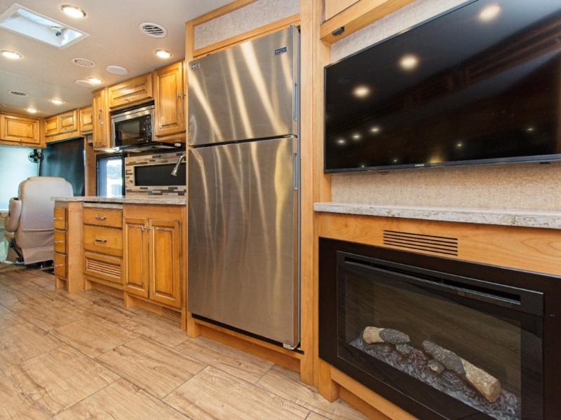 Family-friendly features include a home theater surround sound system with DVD player, creating the perfect atmosphere for movie nights or rainy days on the road. Plus, with customizable decor, tile, leather seating, and cabinetry, you can personalize your Allegro to match your style and lifestyle.