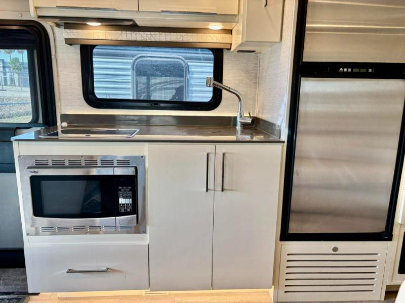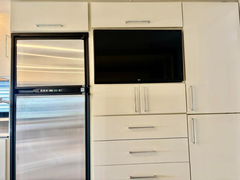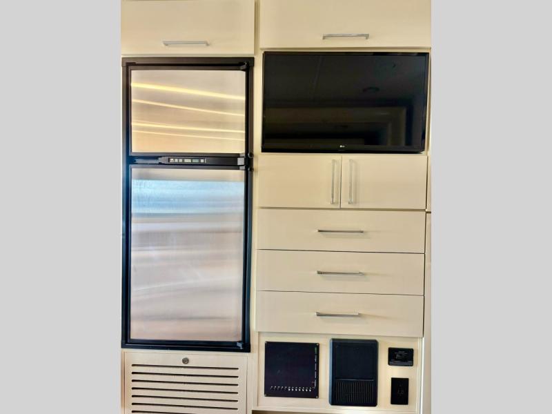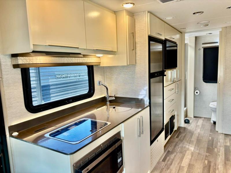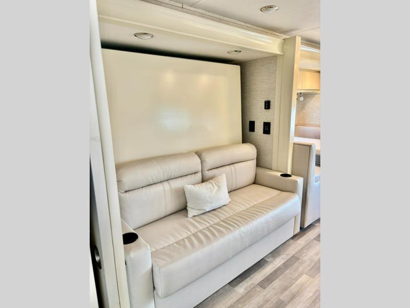 You will love the versatility that this Wayfarer diesel coach allows your family when traveling. With a queen Murphy bed/sofa you can easily make it fit your needs all while on the road. The large slide along the driver's side allows for plenty of space in this 7-1/2 foot wide model. No worries about when or where you will stop on any journey since you have all the amenities you need for any place you decide to make home right at your fingertips. A complete kitchen, including a two burner cooktop and microwave oven, make it easy to create meals and snacks on the go. The rear full bath is another great amenity featuring a 24" x 36" shower with skylight. For your little ones, you can easily use the booth dinette or choose the optional 70" tri-fold sofa/bed in its place, or there is the over the cab loft bed that might be fun as well. In the loft area, you will find a swivel arm 32" TV that can easily be viewed throughout the coach. Another 32" TV in front the Murphy bed allows you to easily watch a move while it is set up in the sofa position, or while in bed.