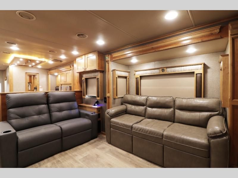 Plush seating including theater seating and tri-fold sofas turn into extra sleeping space.