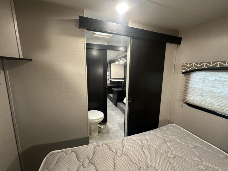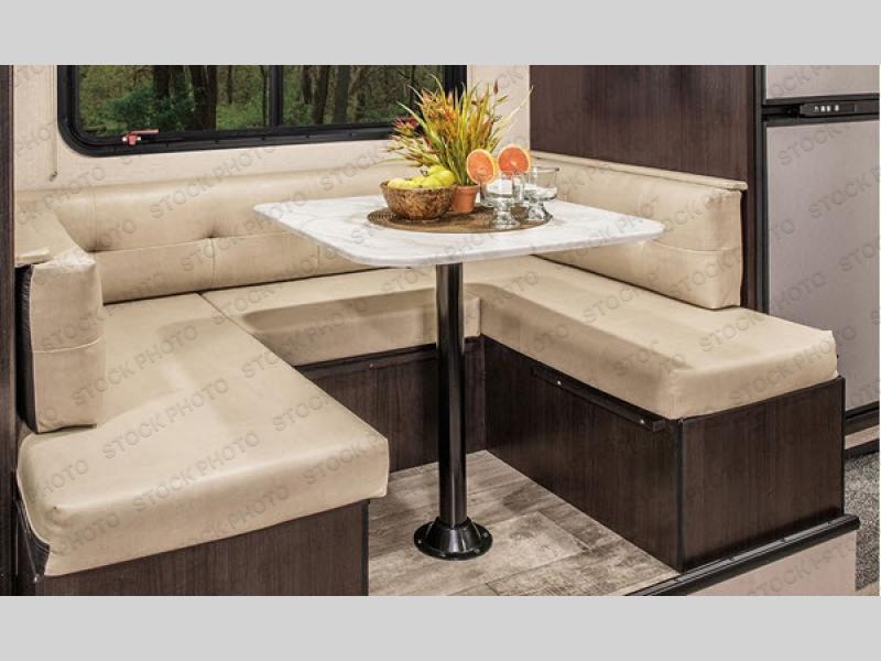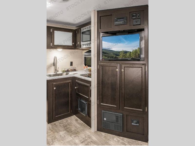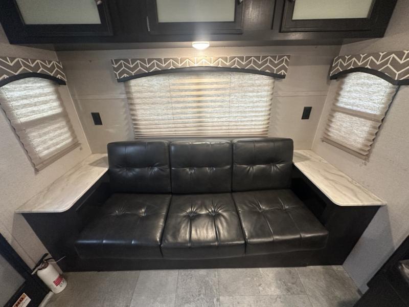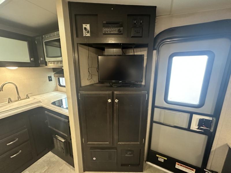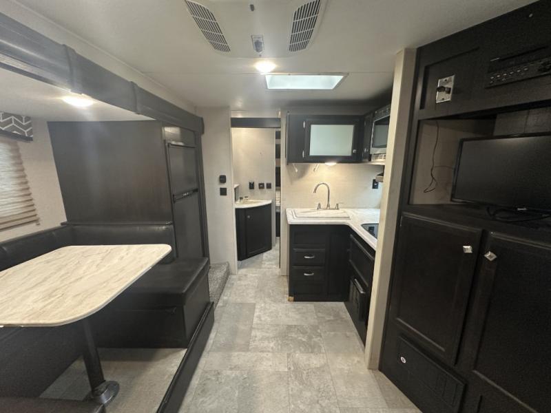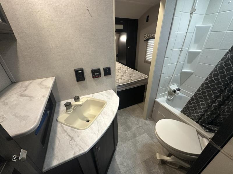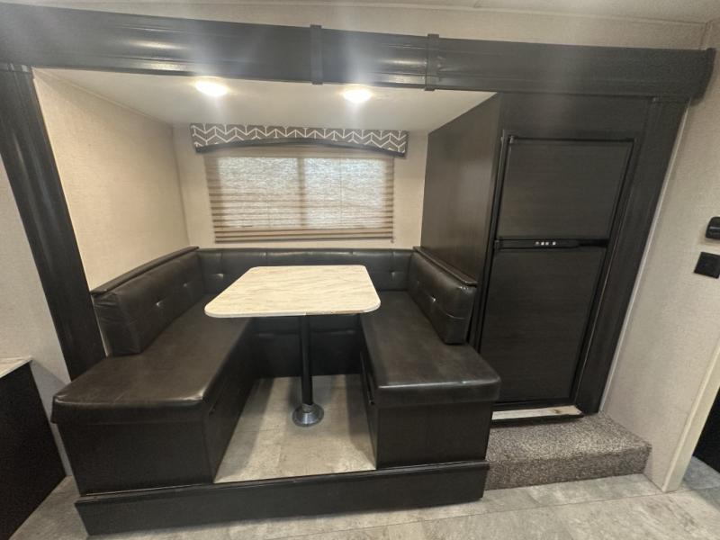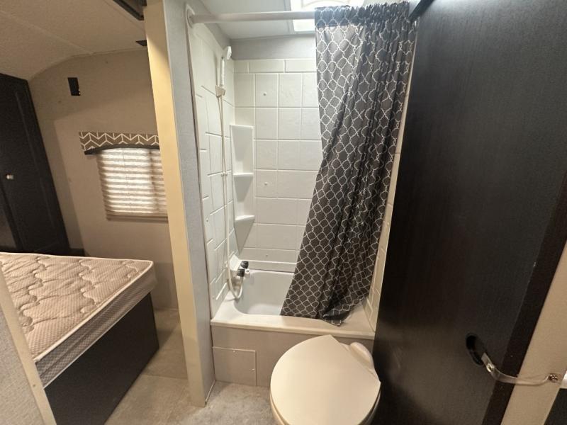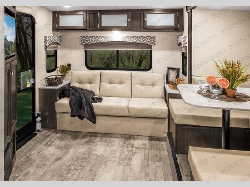 Looking for a couples trailer with extra sleeping space for the grandkids? You'll enjoy your own front private bedroom, while your guests can sleep on the jiffy sofa and U-shaped dinette. The cook will surely love the kitchen that features a two burner cooktop, and a 7 cu. ft. refrigerator that can hold your food for the week. You might like to relax under the 17' awning after being in the sun all day, and take a shower in the walk-through bathroom just before bedtime. There is more to see, take a look!