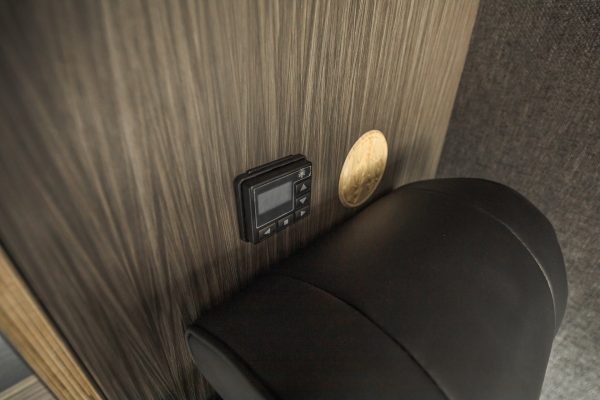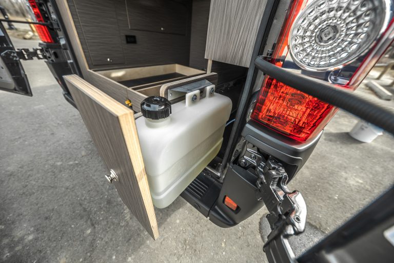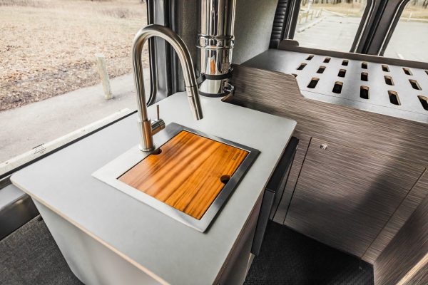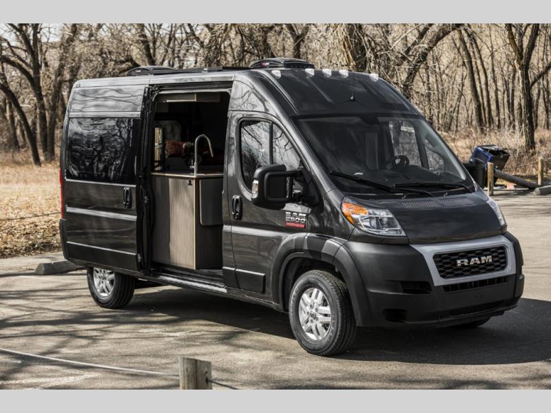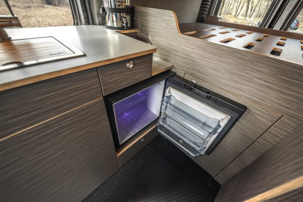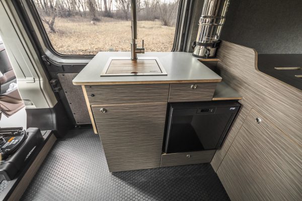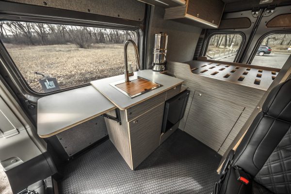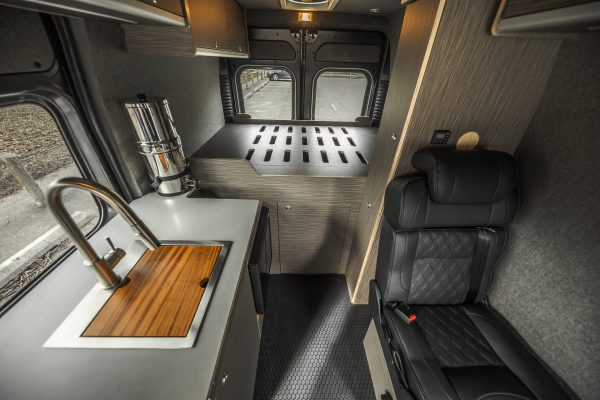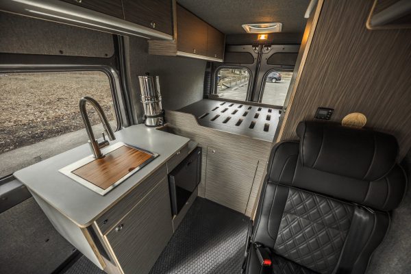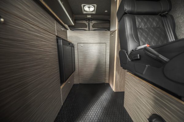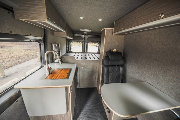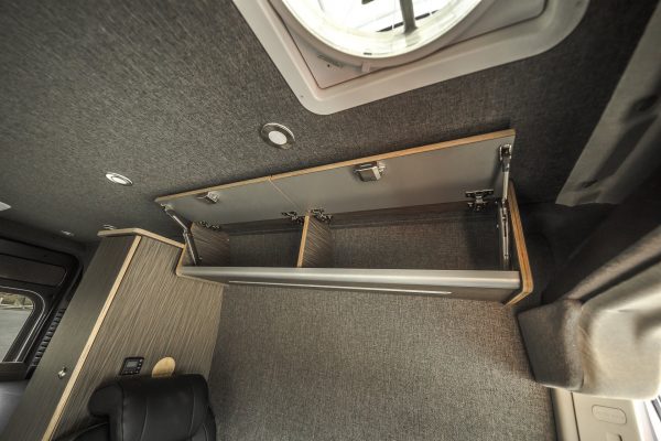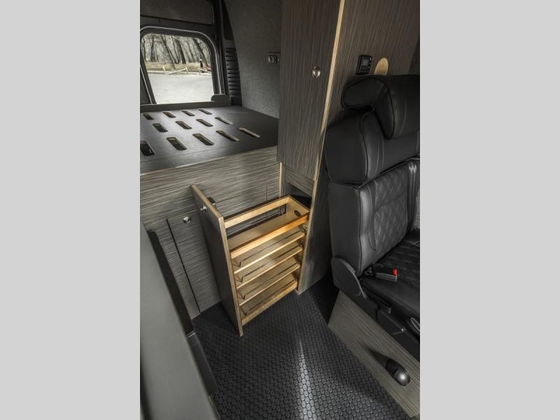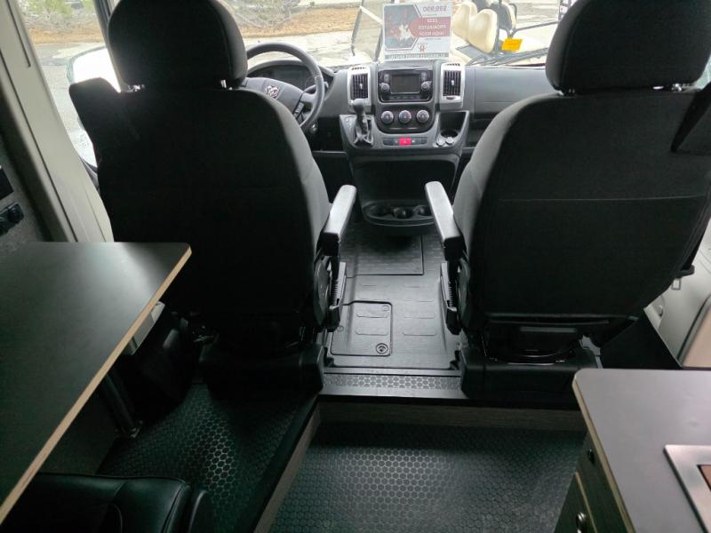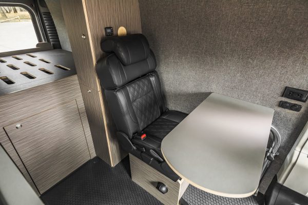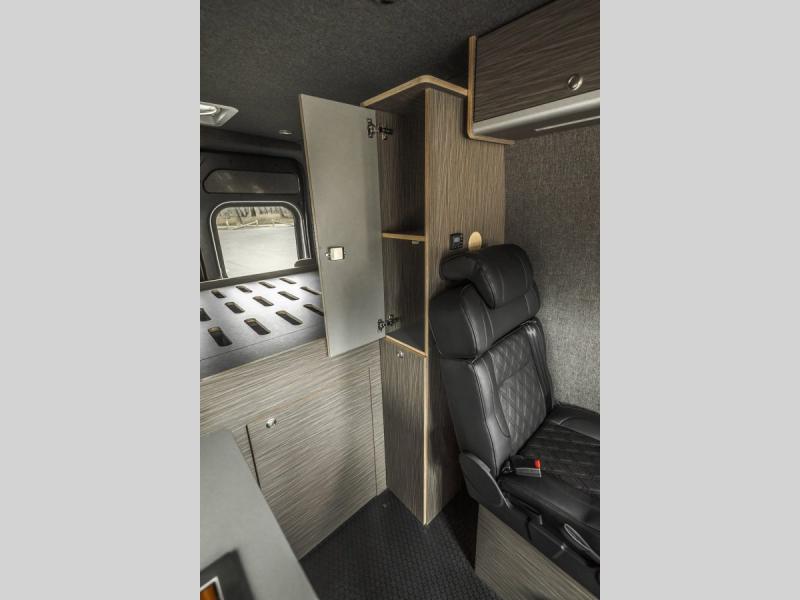 The Rundle floor plan seats and sleeps 3, includes a large rigid bed, a fully equipped passenger side kitchen galley, upper storage throughout, and a Broad Arrow bifold seat that includes a 3-point safety belt. When day turns to night, with the help of dual front swivel seats, this seat layout is designed to transform into another sleeping area for one additional person.