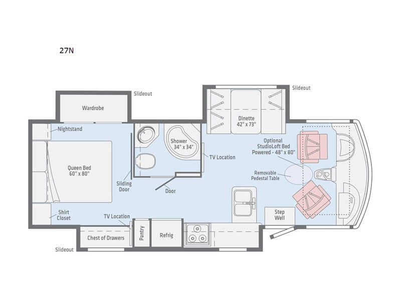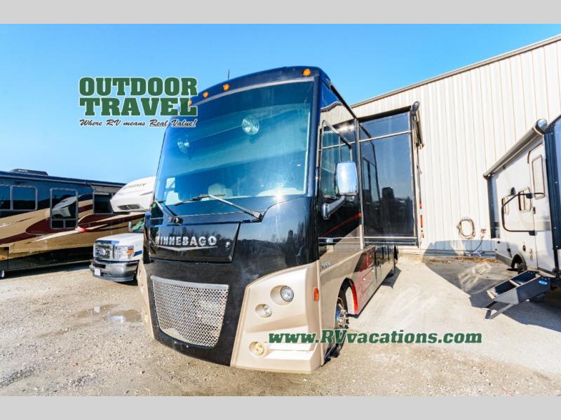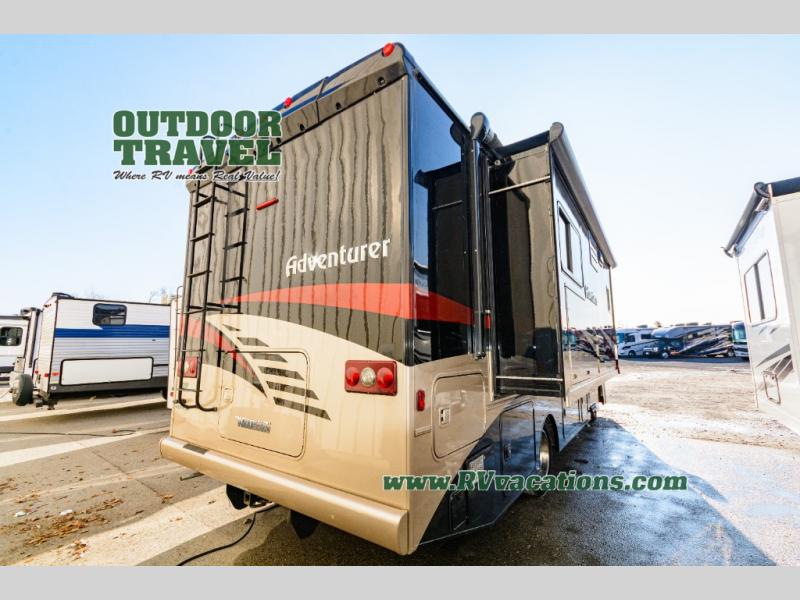 In every Winnebago Adventurer class A gas motorhome you will find a double stainless steel sink, and a three burner cooktop. Each unit also features a bathroom skylight to make you feel right at home, and an optional powered loft bed. These motorhomes include ample storage areas, plus lighted storage compartments, making packing a breeze. Each model includes a powered patio awning with LED lighting, a pet leash tie down, and automatic entrance door steps. Constructed with a premium high-gloss fiberglass skin, and a Triton engine, the Winnebago Adventurer has been made to last. Come choose the best floorplan for your lifestyle today!