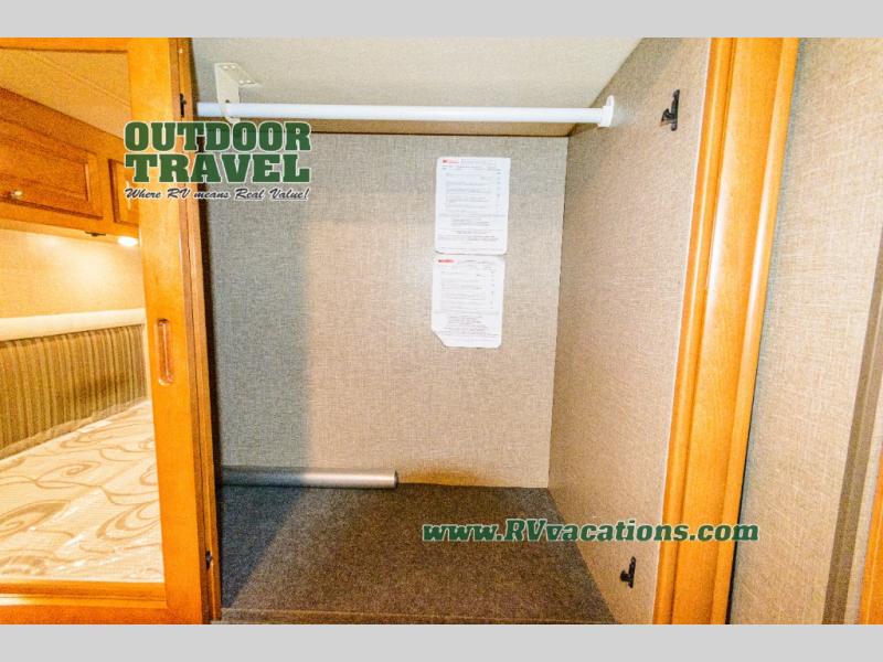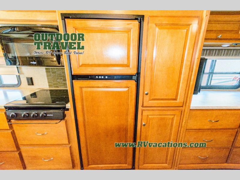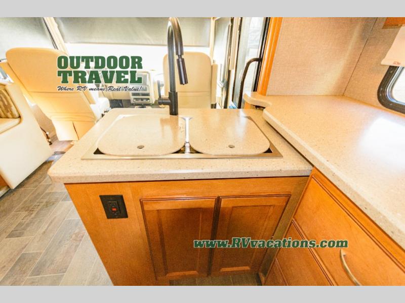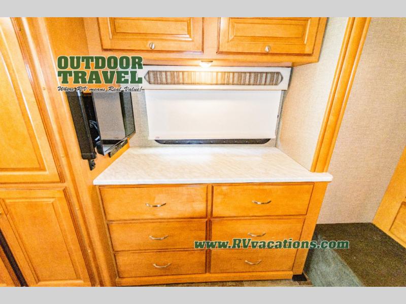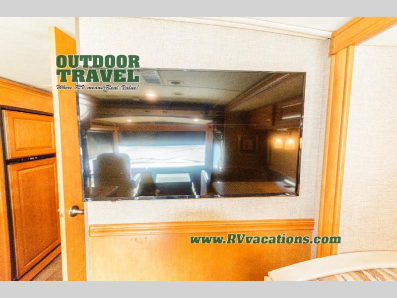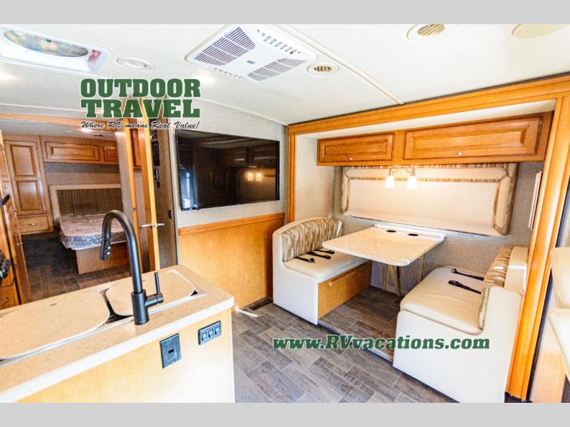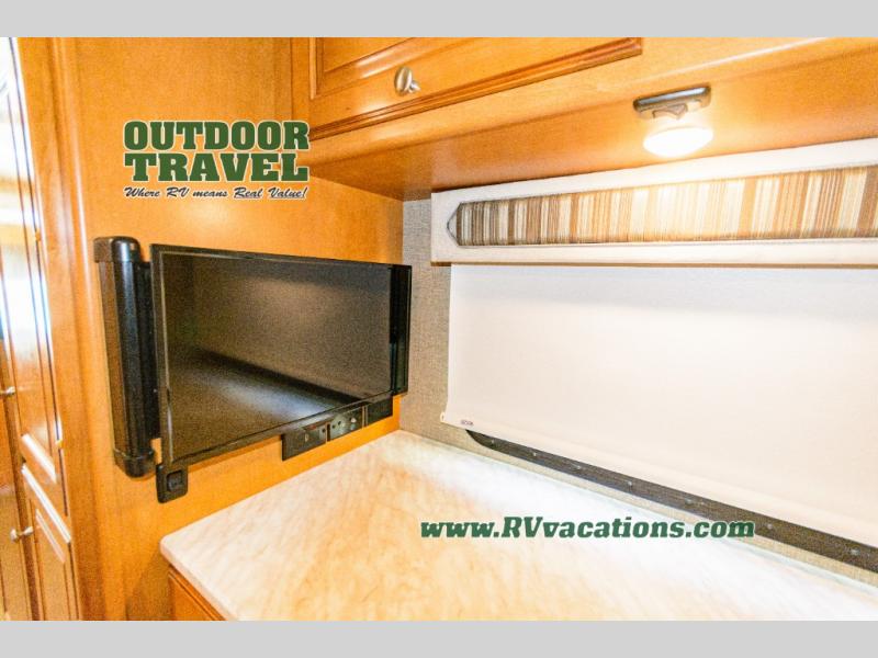 This motorhome has everything you need for your next big vacation. With room for five, you can be sure to have a great time with family and friends. This unit features a sliding door leading to the bedroom with a queen bed with an innerspring mattress and storage below, and a 24" HDTV. Bring along all your dry goods and ingredients for a home cooked meal with a pantry, and a double door refrigerator and freezer in the kitchen. This motorhome also includes three slides, giving you and your guests plenty of room as if you were home. You'll love the bathroom with decorative backsplash, a flexible showerhead, and a linen closet for all your necessities. Enjoy all the amenities this model has to offer, including, a 50" HDTV, a microwave oven, an outdoor entertainment center, plus much more! Adventure is calling your name, hurry in today!