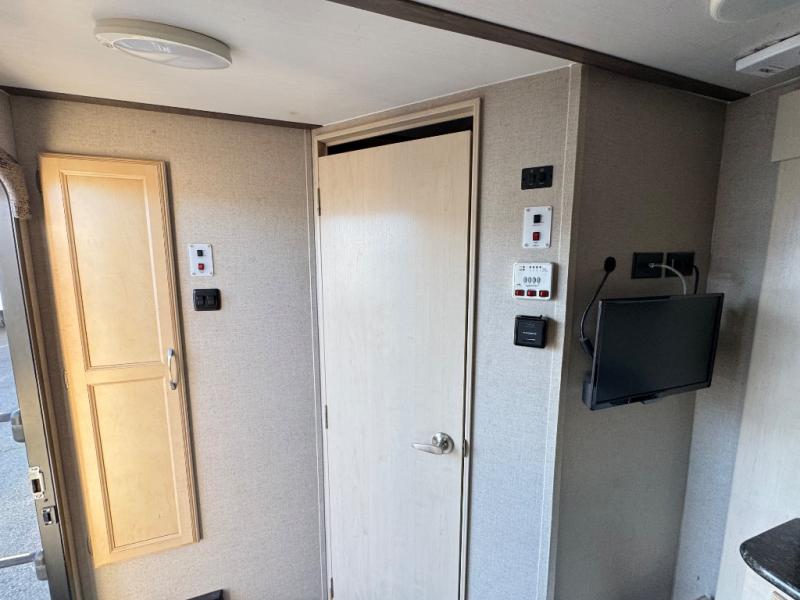 The living area features a flat screen TV with home theater system, and a sofa sleeper