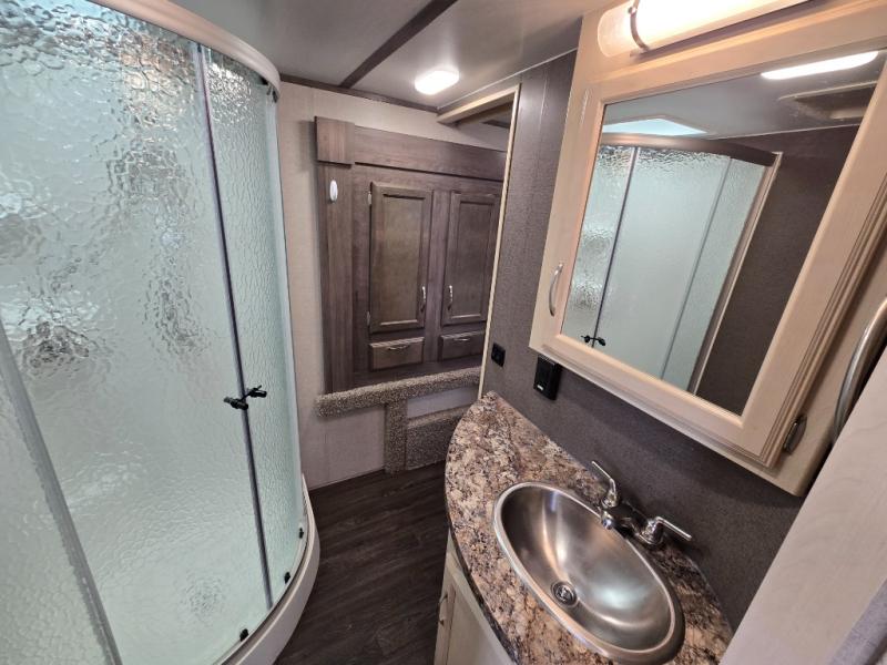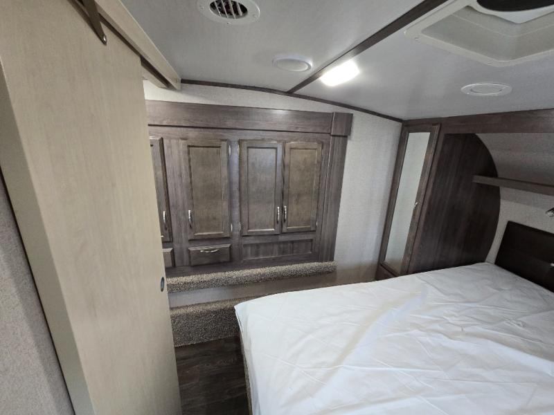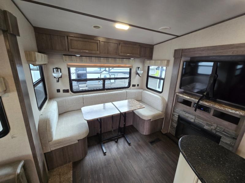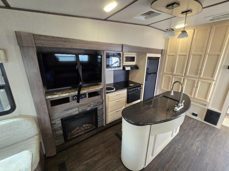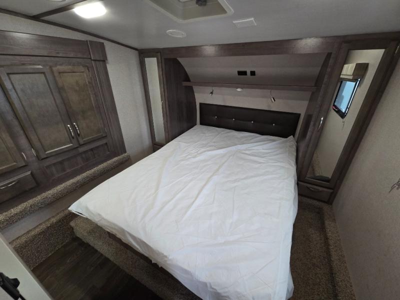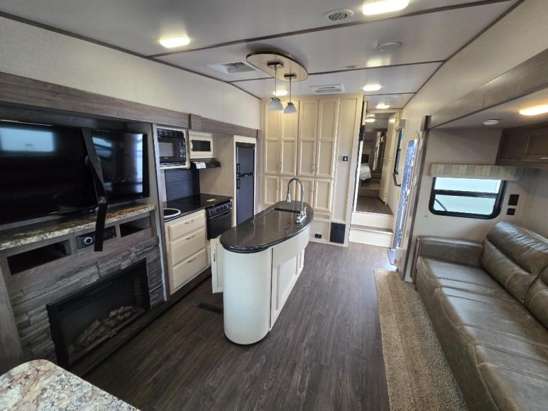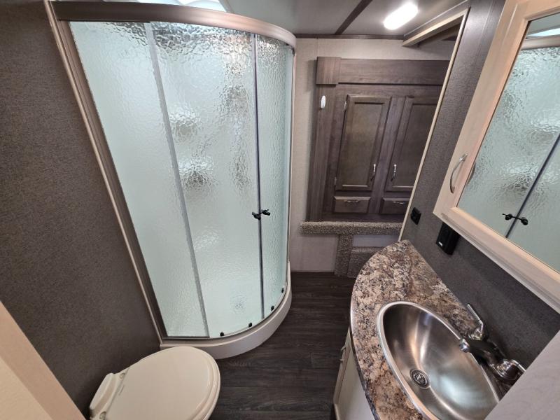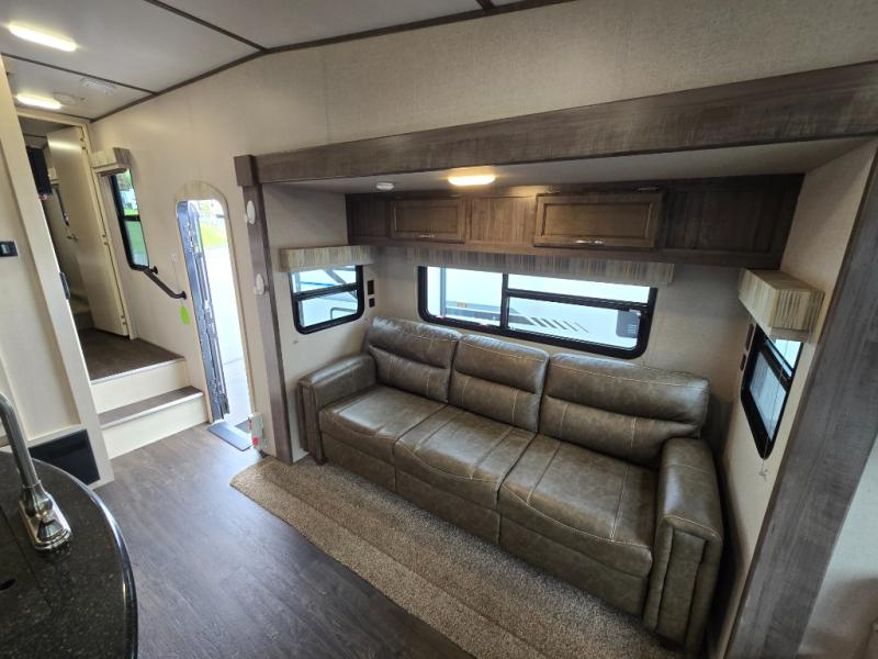 Imagine preparing meals on the kitchen island while the kids are playing outside. You will love the pantry and all the appliances available to make your favorite camp meals. The kids will be taking turns using the USB charging ports for their electronics, and you can relax on the furniture as they tell you stories about their outdoor adventures. You can retreat to the front bedroom when you need some privacy, and the outside awning offers an additional living space to read a book and enjoy the view. You will find two entries into the bath as a convenience that allows easy access from the bedroom for nighttime breaks, and the hallway for the kids.