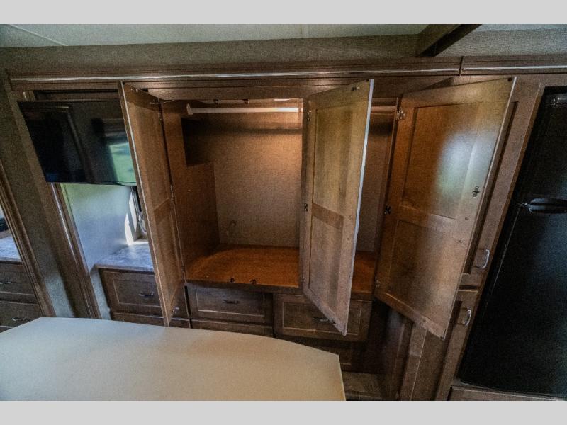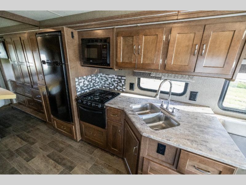 When you travel in this Intent Class A Gas motorhome, you are traveling in an exceptional RV that contains all of the amenities you want and need, plus many extra. The fully stocked kitchen, which is located on the full-wall slide out, contains a residential refrigerator that gives you the space you need to keep your perishable items from spoiling, and everyone will love gathering together each evening in the warm summer air as you party underneath the 22' electric awning with LED lights.