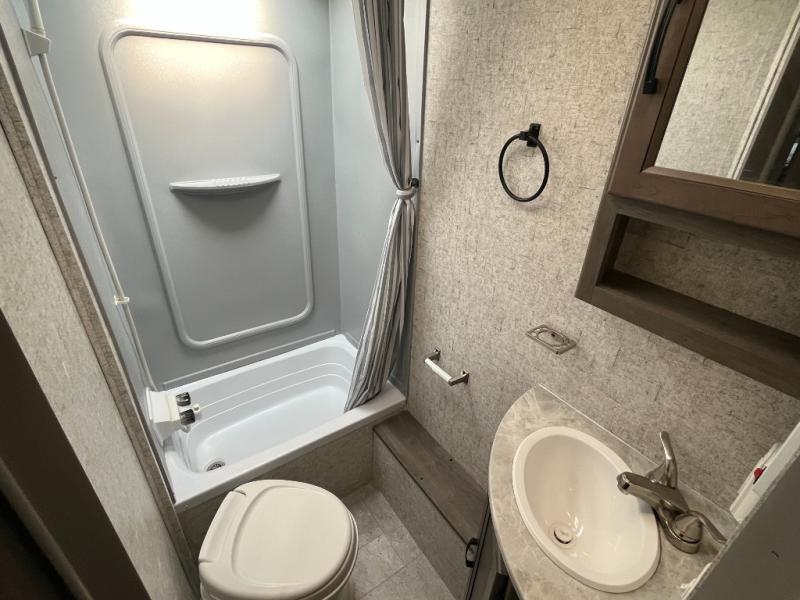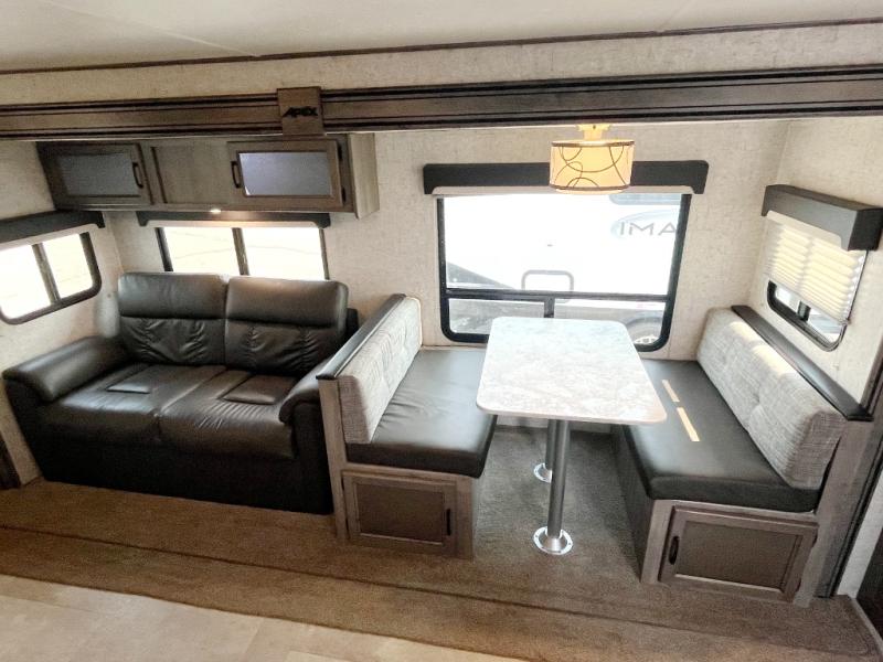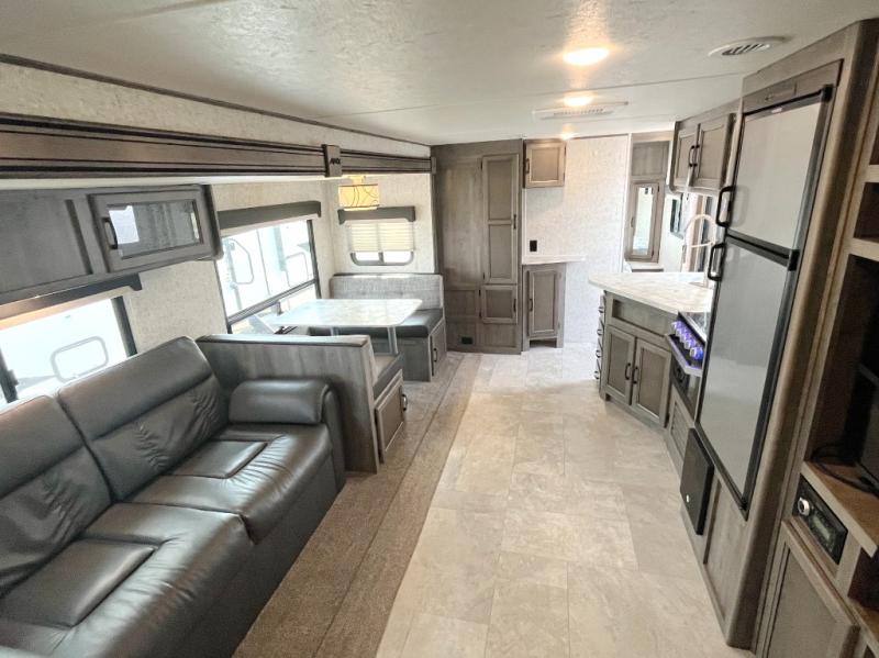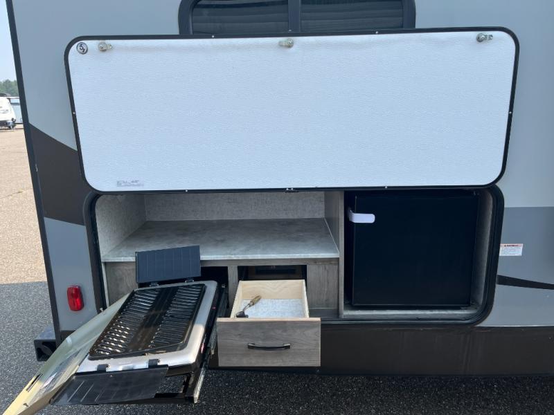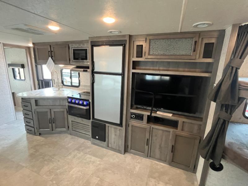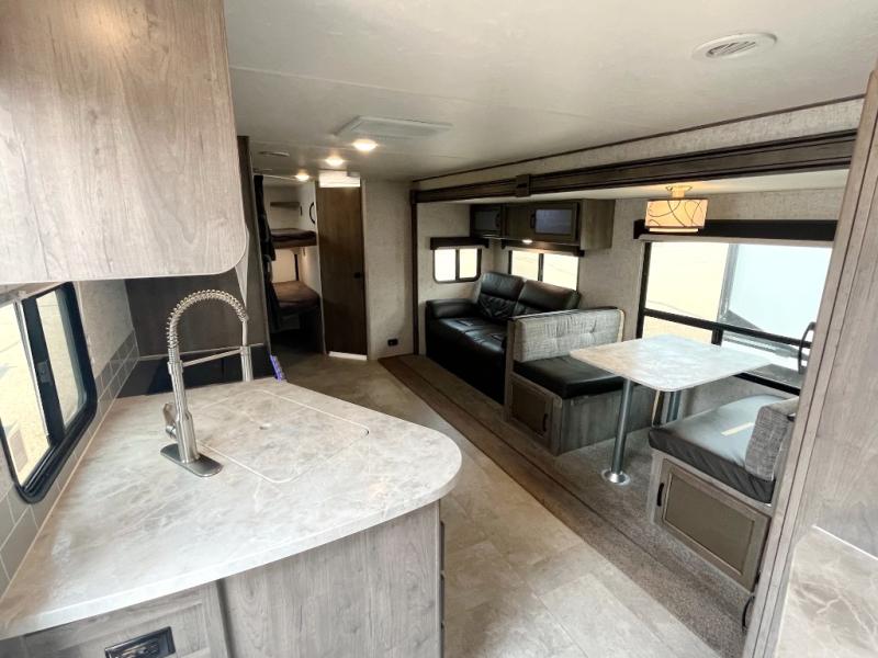 From the camp kitchen and outside TV, to the large slide and rear bath, this travel trailer has it all! Make it a whole family vacation since this unit can sleep up to ten people. The kids will love the double bunk beds and mom and dad will enjoy the queen bed in the front private bedroom. You'll find additional sleeping space on the tri-fold sofa or dinette once folded down for the night. This model features a stainless steel microwave and a three burner range to prepare all your meals while away from home. Make it a movie night with an entertainment center with an LED TV inside, or grab your comfy blanket, cuddle up with the kids, and watch the movie on the outside TV under the power awning with LED Lights.