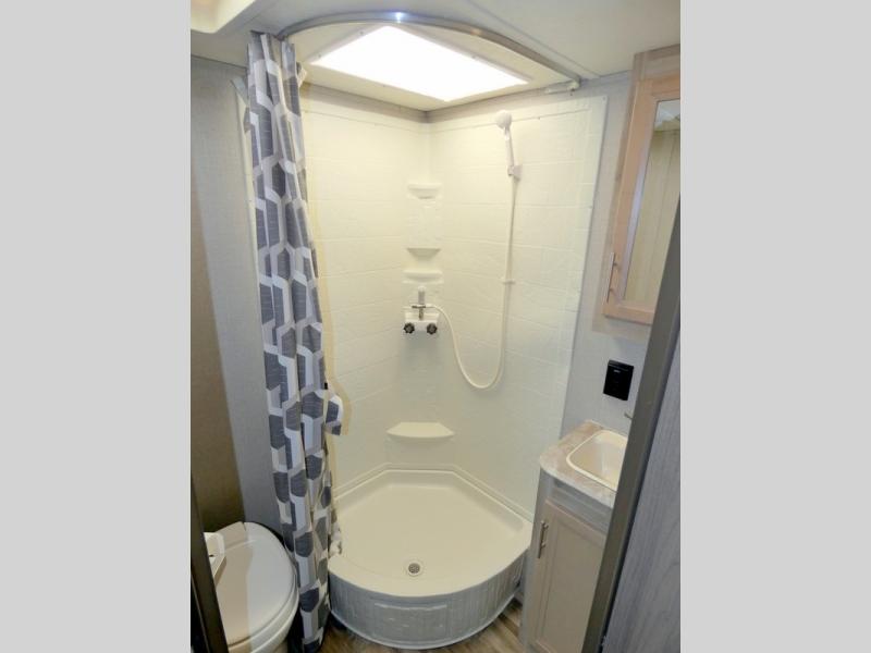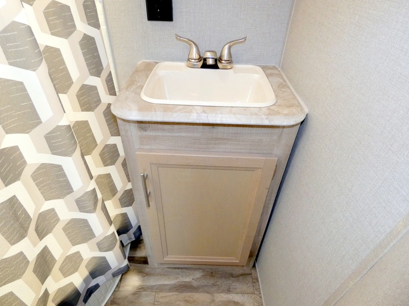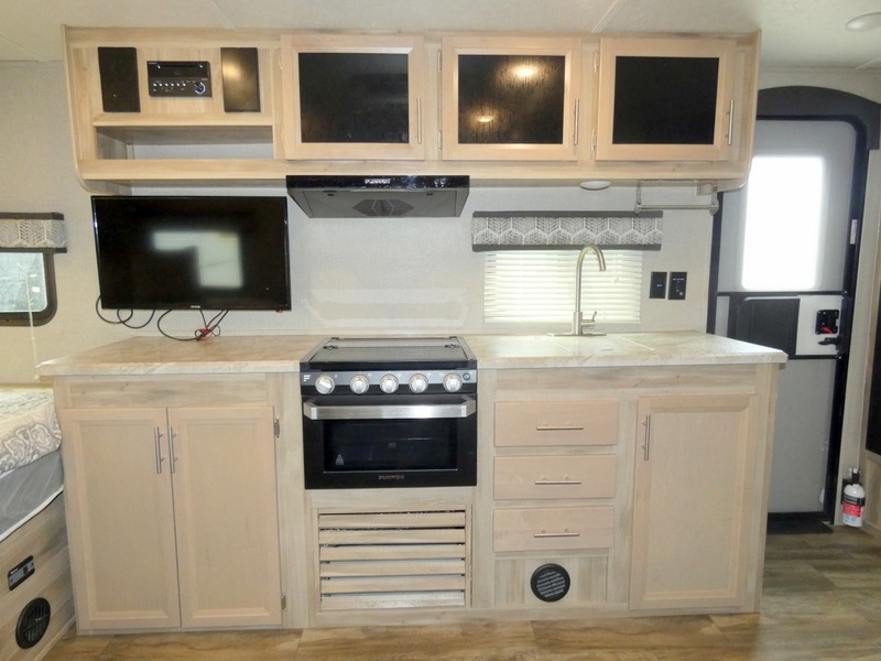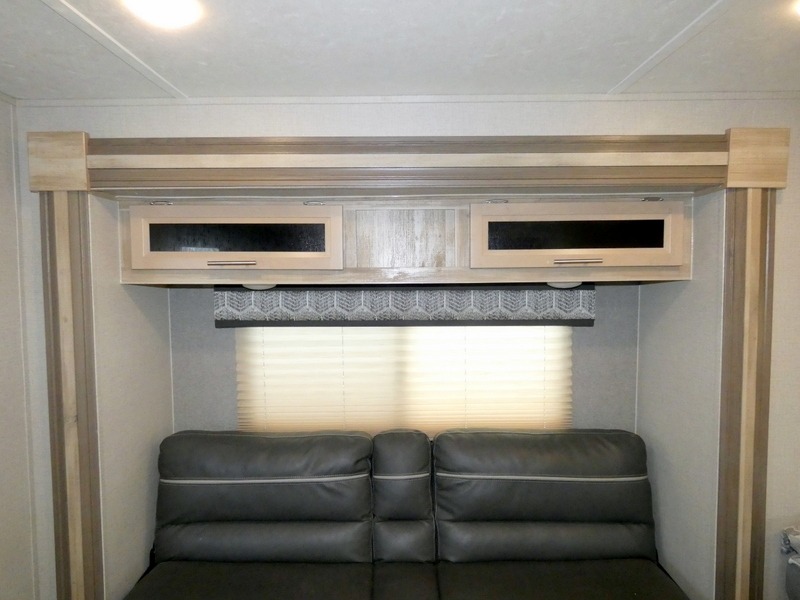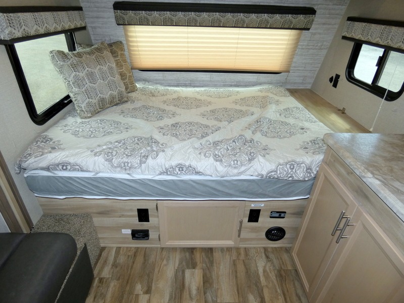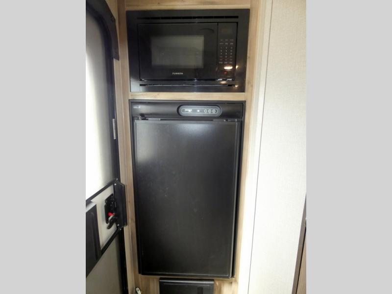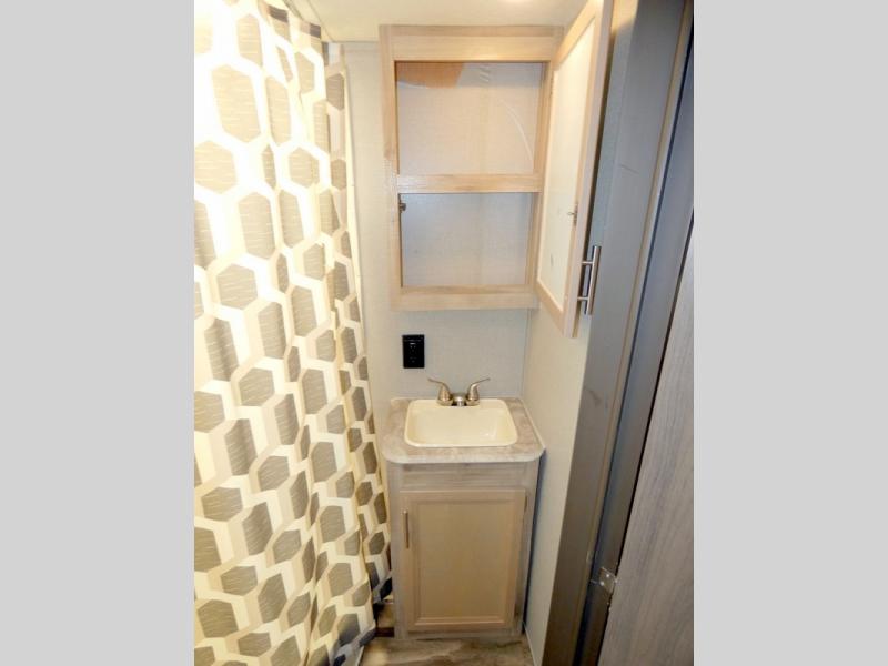 You and your spouse will love camping near and far in this travel trailer with a single slide providing a little more interior space to walk around, stretch your legs and dine. This area is also great for an overnight guest or two small children to sleep on. Spend your days outside swimming at the lake or hiking trails to return to the full bath with a radius shower that will allow you to get cleaned up before bed. You will find a queen bed with a countertop at the foot of the bed for your book or phone, and you'll have a great view of the 32" 12 volt DC TV for a late-night show. No wonder this unit was voted Best of Show for 2020 by RV Pro!