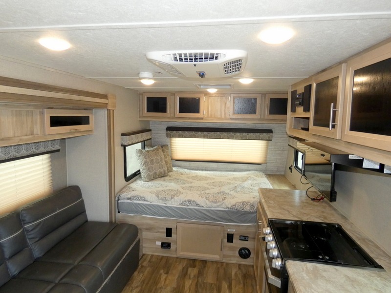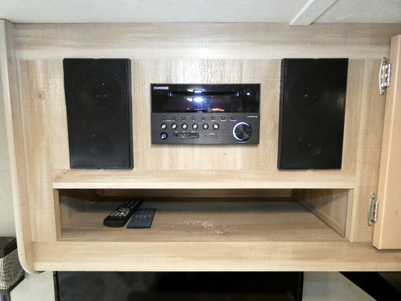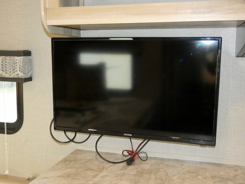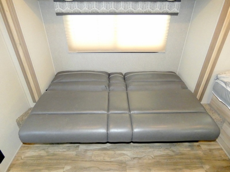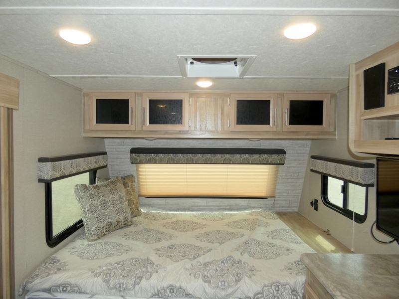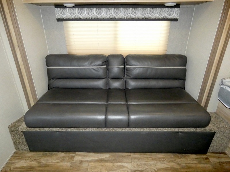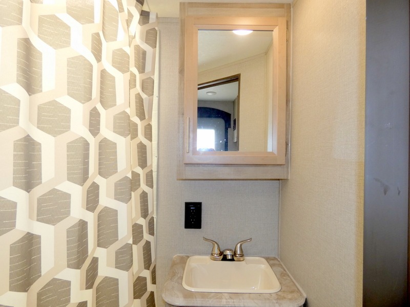 You and your spouse will love camping near and far in this travel trailer with a single slide providing a little more interior space to walk around, stretch your legs and dine. This area is also great for an overnight guest or two small children to sleep on. Spend your days outside swimming at the lake or hiking trails to return to the full bath with a radius shower that will allow you to get cleaned up before bed. You will find a queen bed with a countertop at the foot of the bed for your book or phone, and you'll have a great view of the 32" 12 volt DC TV for a late-night show. No wonder this unit was voted Best of Show for 2020 by RV Pro!