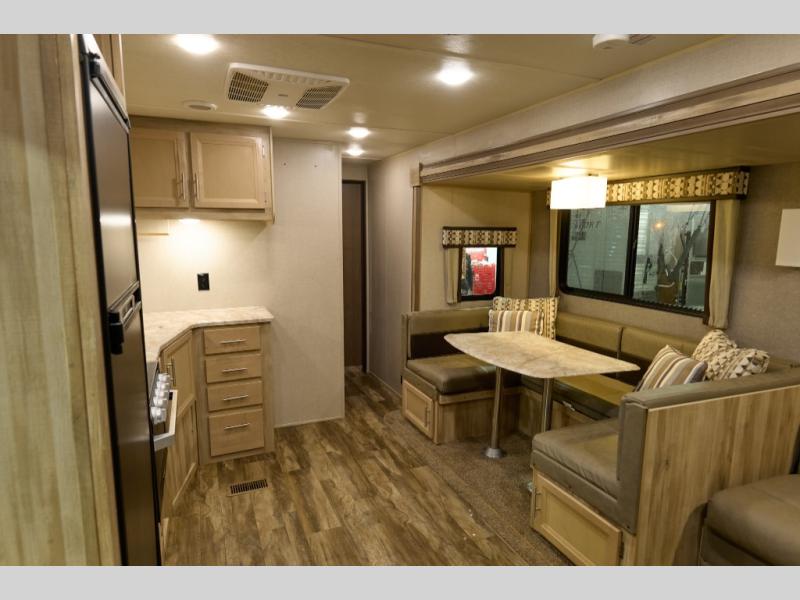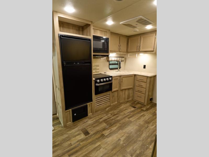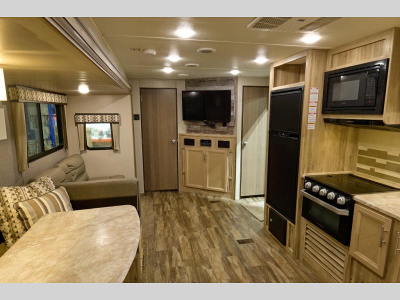 The private bunkhouse in back and private bedroom up front create comfortable sleeping accommodations for a total of ten people in this Catalina Legacy Edition travel trailer! A large slide that holds a U-shaped dinette and theater sofa gives the central living area some extra space so that you can feel free to cook dinner in the kitchen on the three-burner range.