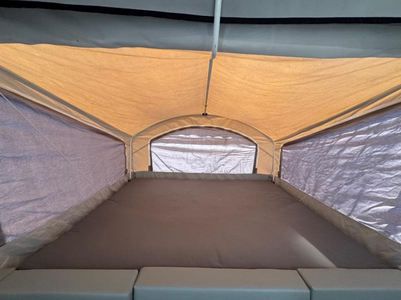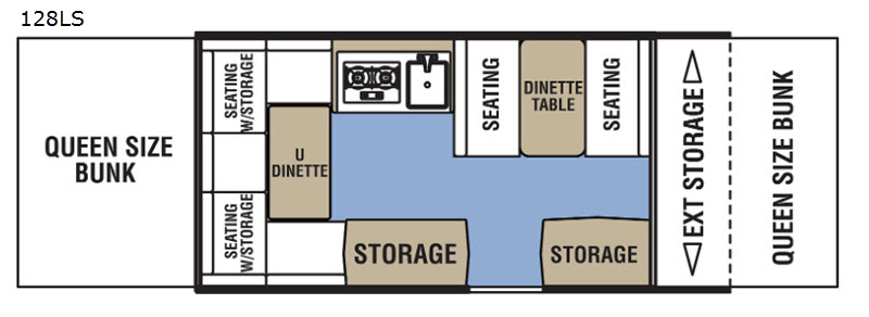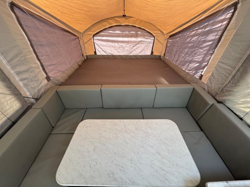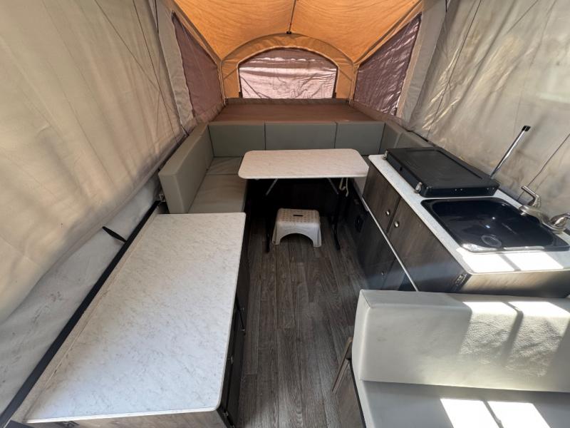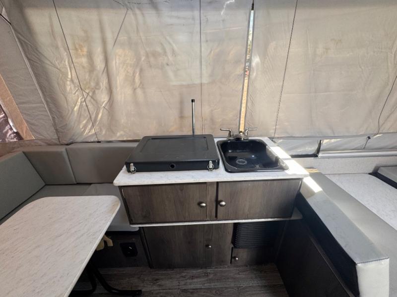 You will enjoy lots of floor space with two queen tent end beds and dining space with a booth dinette and a U-shaped dinette. And there is storage under the seating and near the entry. Outside you will find more storage, and you can sit under the awning in your camping chairs if you remembered to bring them. When everyone gets hungry, head inside to use the two burner high output range, the residential laminated countertops, and the 1.9 cu. ft. 3-Way refrigerator, as well as the deep bowl acrylic sink to clean the pots and dishes.