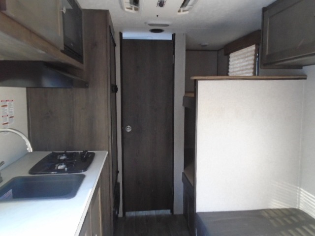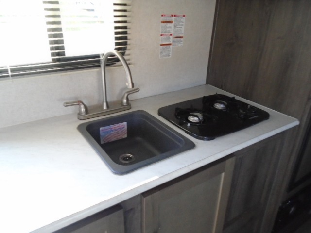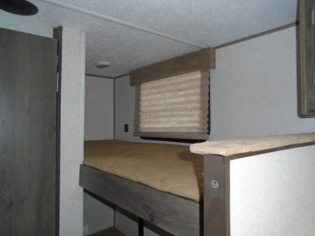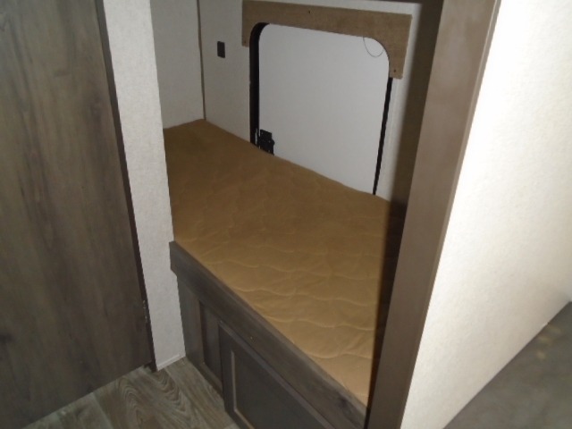The rear set of bunk beds in this travel trailer are sure to be a hit with the kids! Up front there is a 54" x 74" bed with overhead cabinets, and next to it is the booth dinette where you can enjoy your meals, play games, and even transform into an extra sleeping space if needed. The kitchen pantry is also big enough to store everyone's favorite snacks. End your nights by taking a hot shower in the full bathroom!