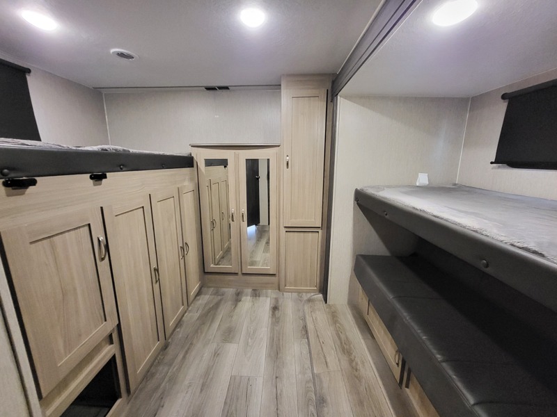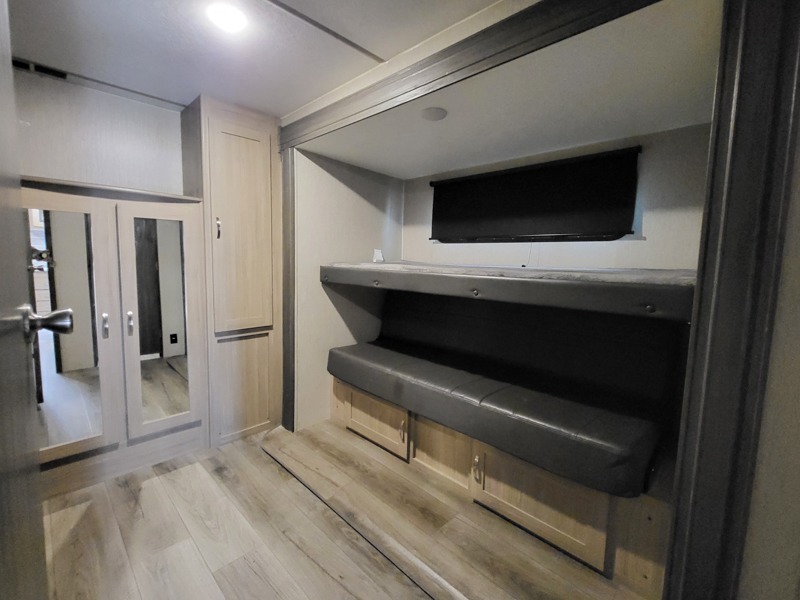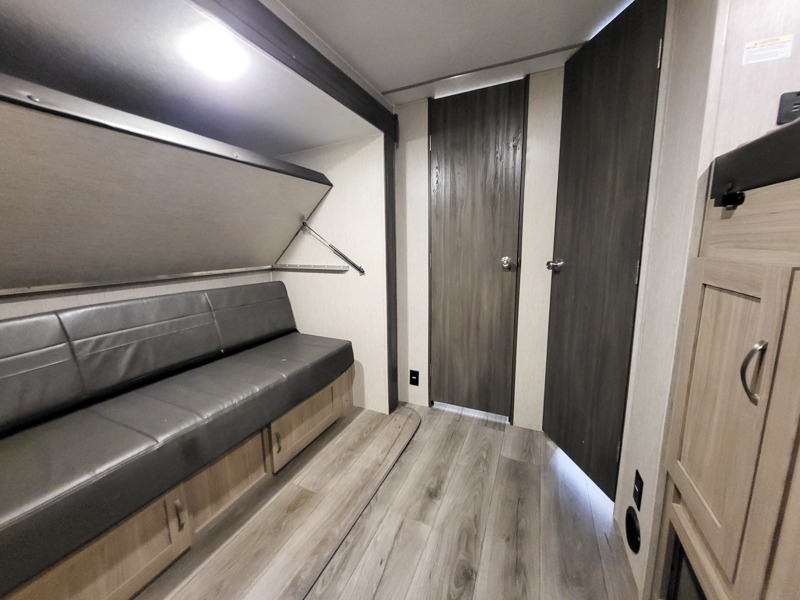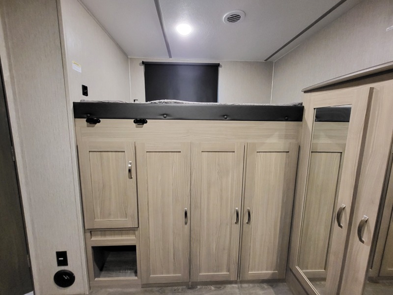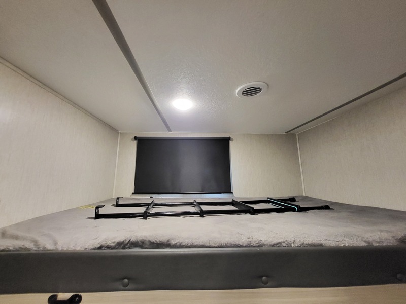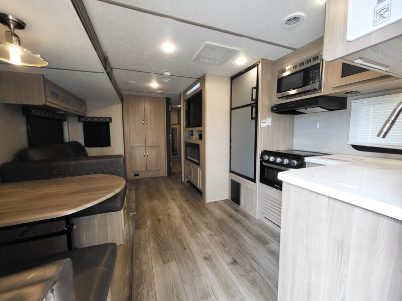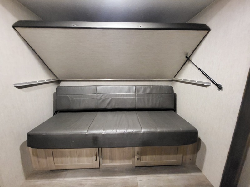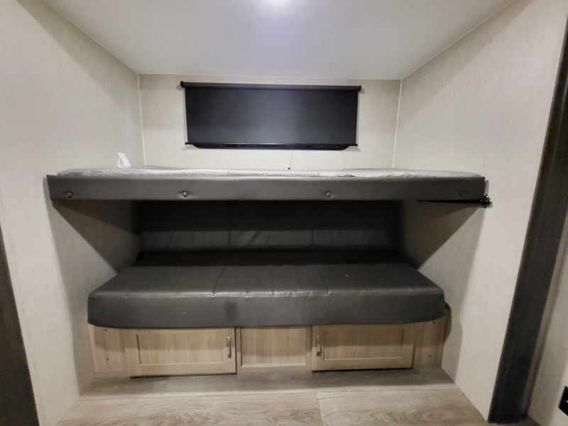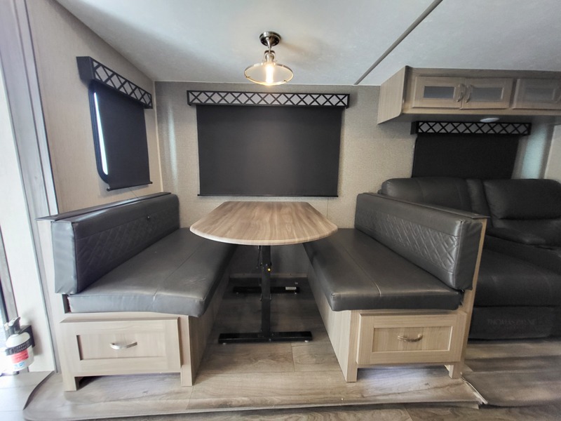 The cook will love the L-shaped kitchen to make warm meals for the kids and their friends and the large slide out here will provide space to do so. The private bunkhouse features a slide out J-cube sofa with a table and flip-up bunk above so the kids have enough space to play on the floor if they want. There is also another larger bunk and plenty of storage, plus a half bath. You might like to relax on the hide-a-bed sofa or read a book at the booth dinette while staying warm from the fireplace. Everyone can take turns getting cleaned up in the full bathroom each morning before deciding to go fishing, to relax under the awning, or to prepare for a day-long hike in the woods. The USB ports in the bedroom and bunkhouse will keep the phones charged and ready for what's next, plus the exterior pass-through storage will allow you to stow away larger items like camp chairs, charcoal, and fishing poles.