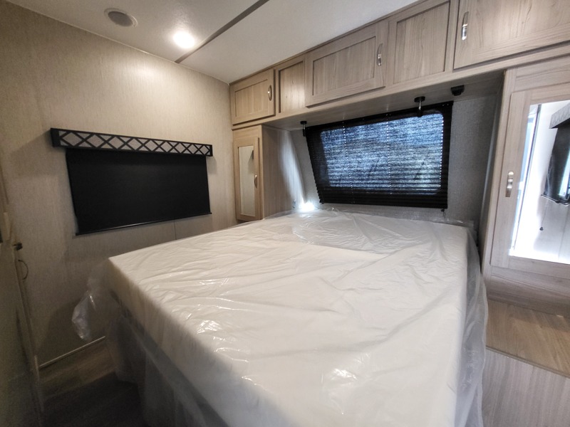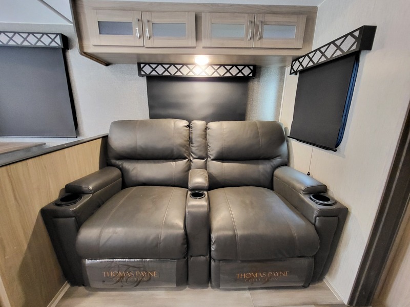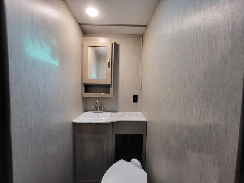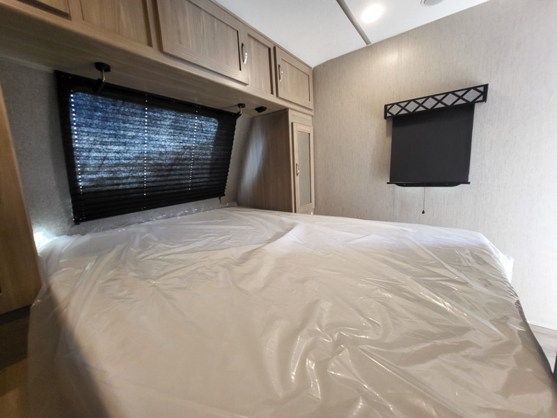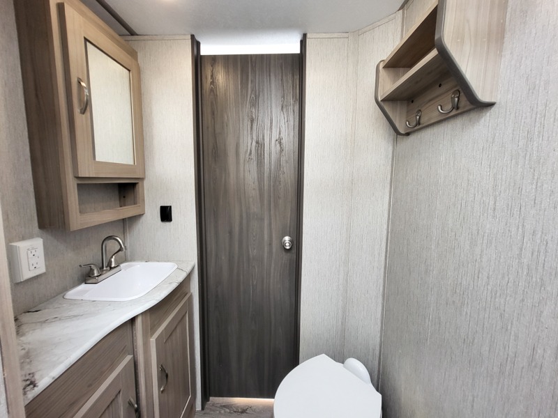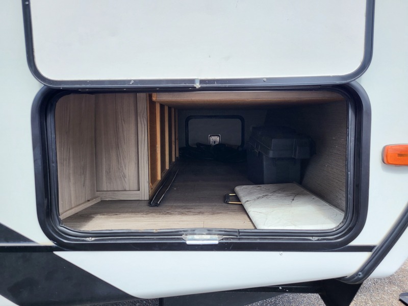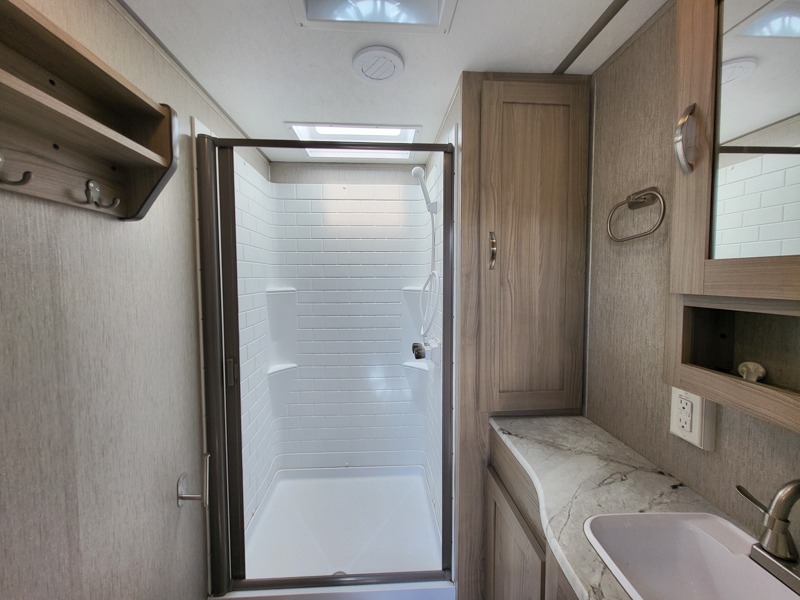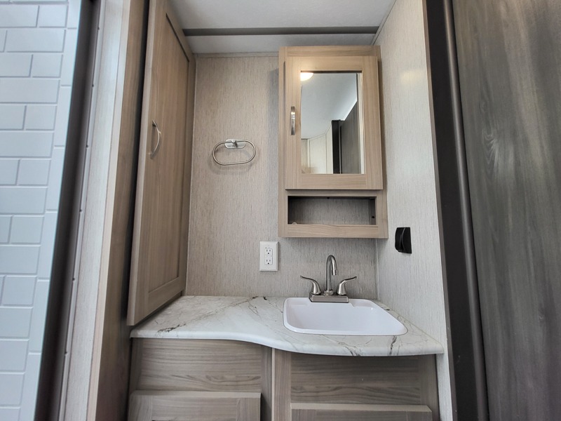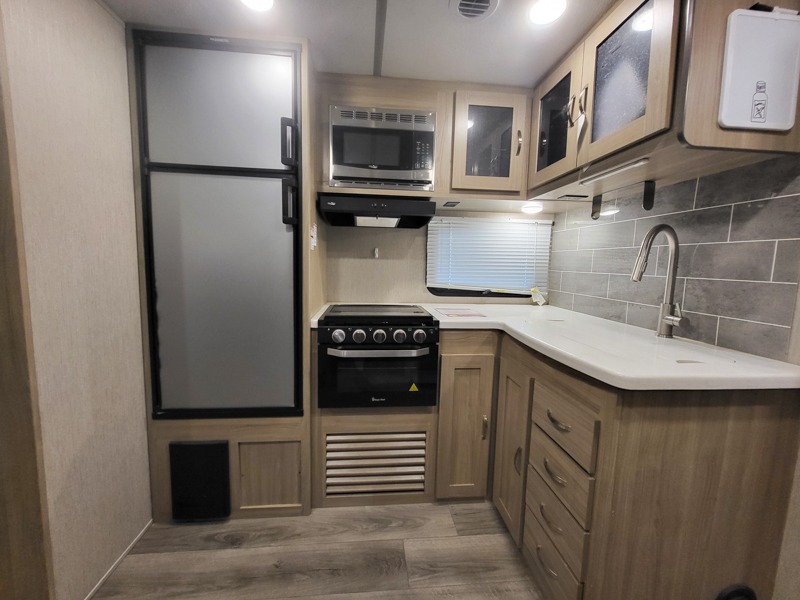 The cook will love the L-shaped kitchen to make warm meals for the kids and their friends and the large slide out here will provide space to do so. The private bunkhouse features a slide out J-cube sofa with a table and flip-up bunk above so the kids have enough space to play on the floor if they want. There is also another larger bunk and plenty of storage, plus a half bath. You might like to relax on the hide-a-bed sofa or read a book at the booth dinette while staying warm from the fireplace. Everyone can take turns getting cleaned up in the full bathroom each morning before deciding to go fishing, to relax under the awning, or to prepare for a day-long hike in the woods. The USB ports in the bedroom and bunkhouse will keep the phones charged and ready for what's next, plus the exterior pass-through storage will allow you to stow away larger items like camp chairs, charcoal, and fishing poles.