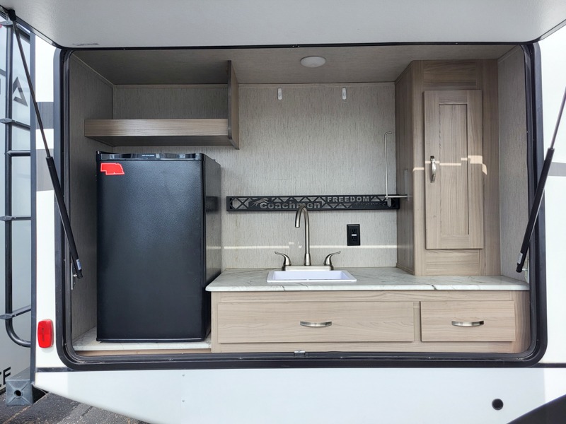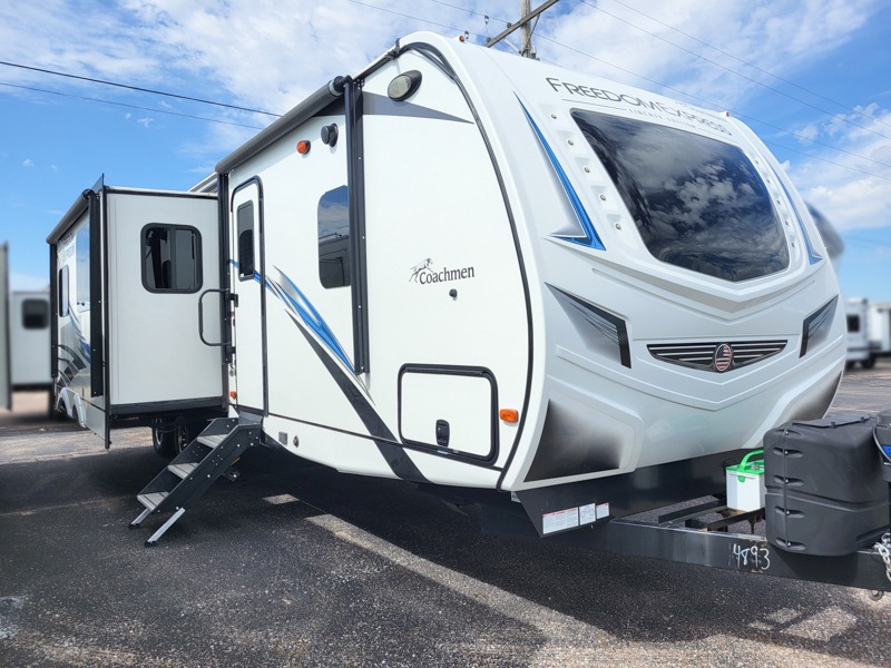 With any Freedom Express Liberty Edition travel trailer by Coachmen RV you will enjoy years of use thanks to the Alumicage construction and the Azdel Onboard composite wall panels that provide superior strength and water protection. The unique front automotive glass windshield will give you great views from inside, and you will love the hidden hinge cabinetry, the stainless steel sink with pull-out sprayer faucet, the slotted knife storage behind the stove, plus the slider pots and pans drawers under the dinette. And you can tow easily with your mid-size SUV or half-ton vehicle, plus the Winegard 360+ WIFI and 4G prep may come in handy. Choose your favorite affordable, value-packed model today, and start camping tomorrow!