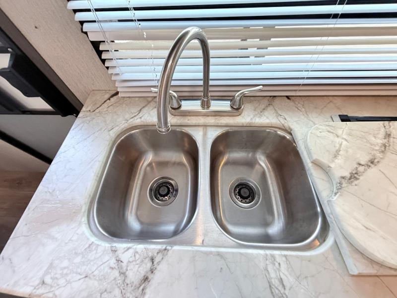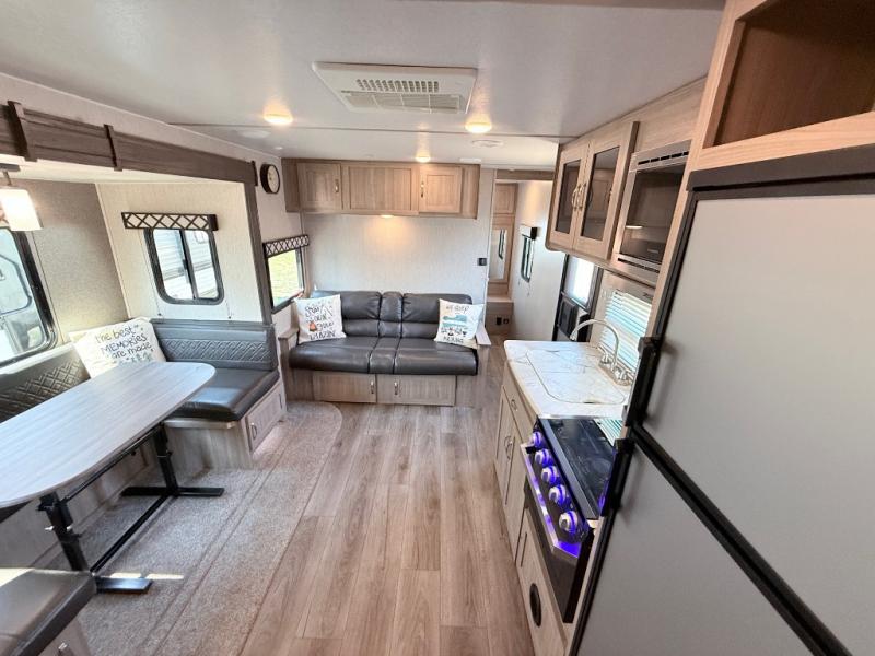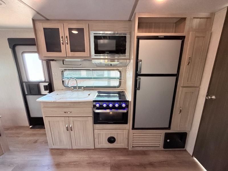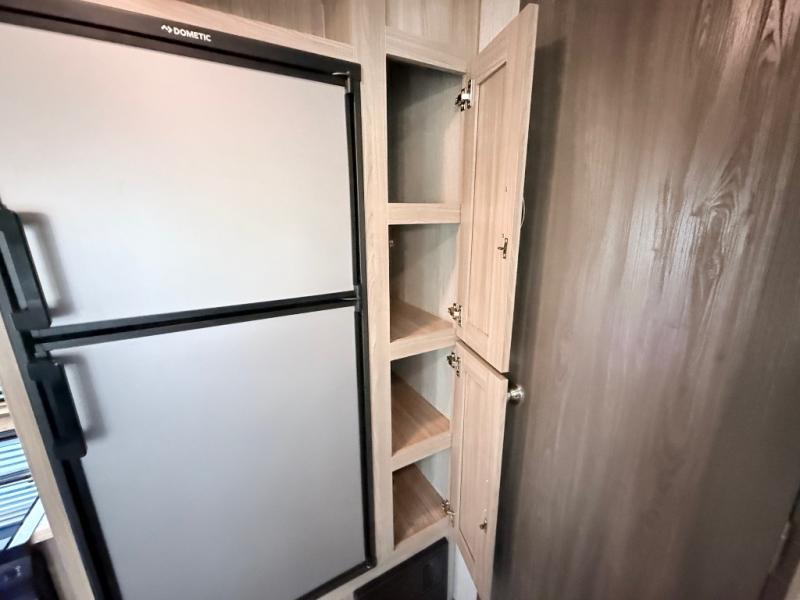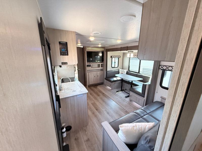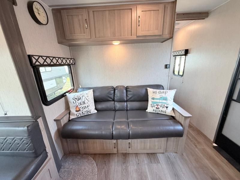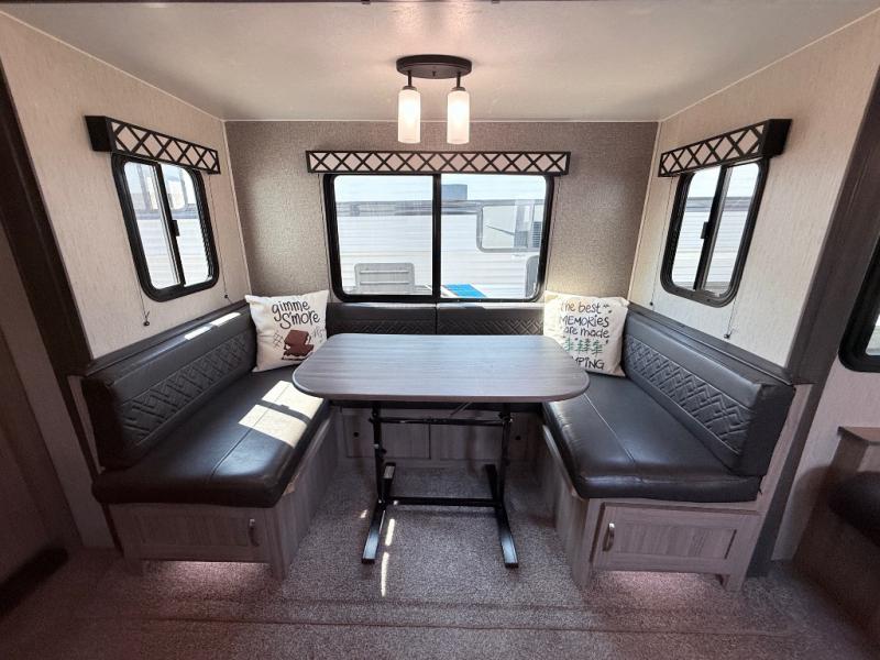 This Freedom Express Ultra Lite travel trailer allows you to relax like you do at home with more interior space thanks to the slide out in the living area. You'll appreciate the front private bedroom with a queen bed and wardrobes for your clothes. The kids can make their beds either on the U-shaped dinette or the sofa once folded down for the night. This unit features a full rear bath with a 32" radius shower and a linen closet for towels. If you enjoy cooking outdoors, then imagine making dinner for everyone at the outdoor camp kitchen!