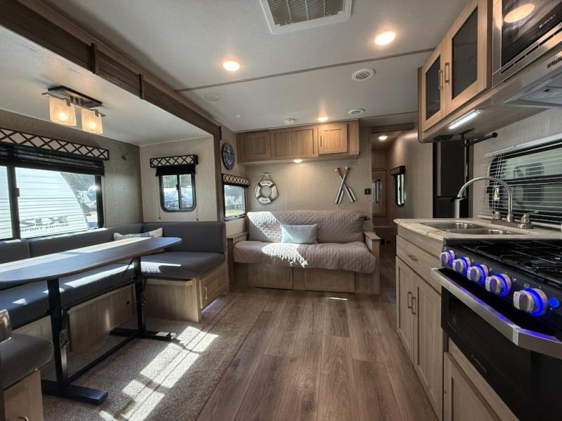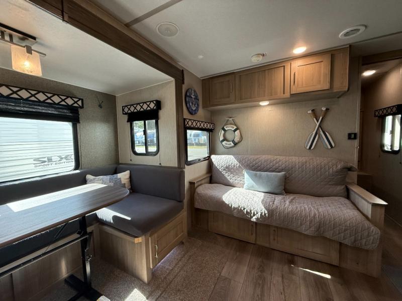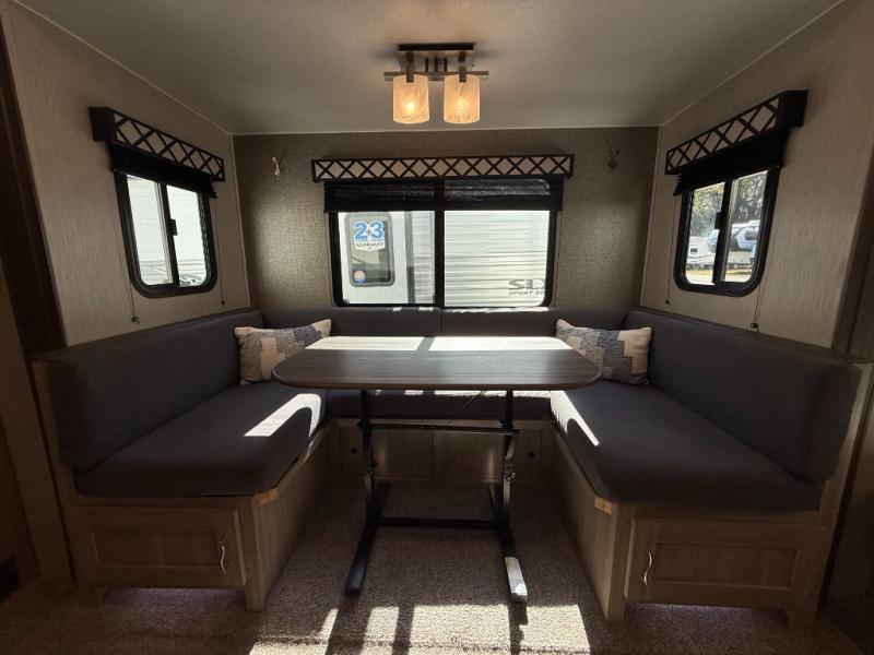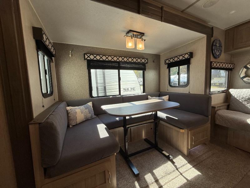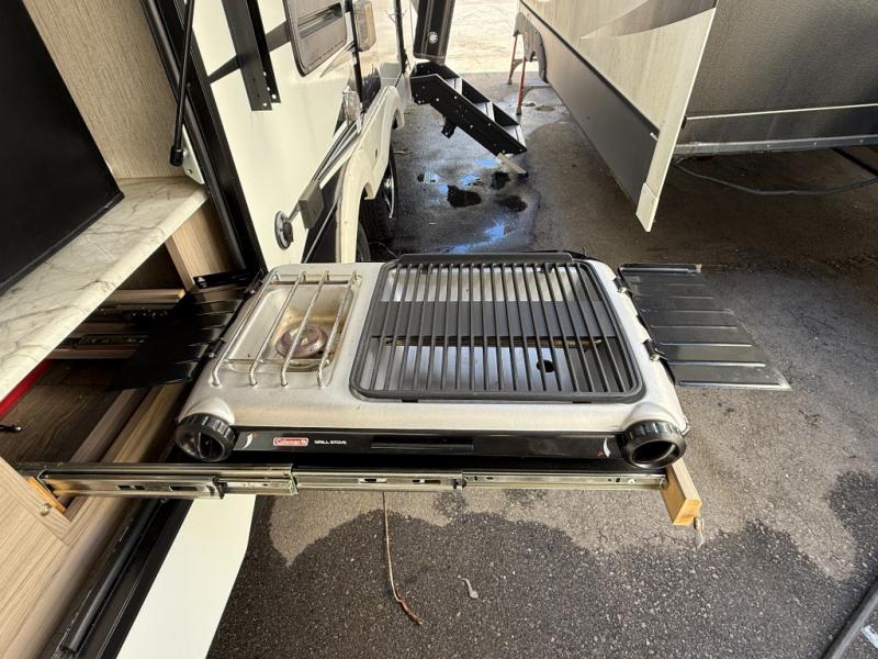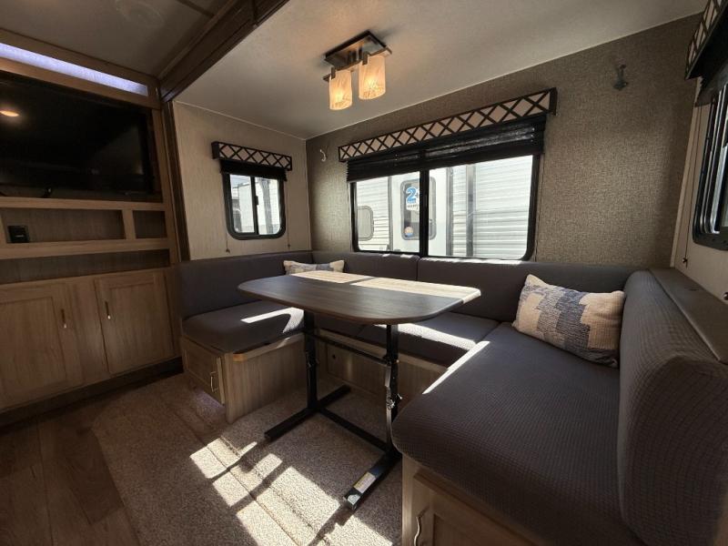 This Freedom Express Ultra Lite travel trailer allows you to relax like you do at home with more interior space thanks to the slide out in the living area. You'll appreciate the front private bedroom with a queen bed and wardrobes for your clothes. The kids can make their beds either on the U-shaped dinette or the sofa once folded down for the night. This unit features a full rear bath with a 32" radius shower and a linen closet for towels. If you enjoy cooking outdoors, then imagine making dinner for everyone at the outdoor camp kitchen!