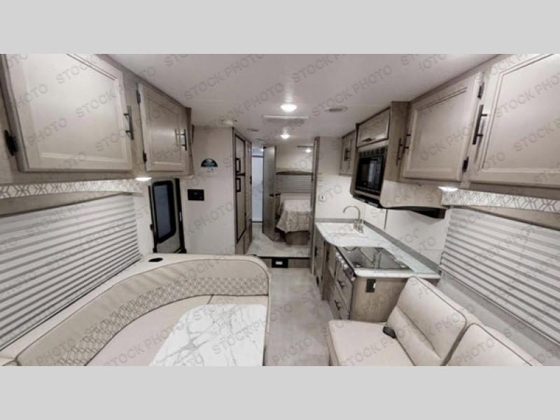 With the Freelander motorhome you will get a reliable and quality Class C gasoline coach that contains more factory-installed features than anyone else. The Freelander features Azdel composite walls and a fiberglass exterior to keep the entire structure lightweight, and is has been prepped for solar panels to make it easier for you to go off-grid whenever you choose to do so. LED lighting and high-quality furnishings, like the nutmeg wood grain cabinets and kitchen backsplash, give the Freelander's interior a touch of elegance, and the reclining cab seats will be helpful to have as you make your way across the countryside.
