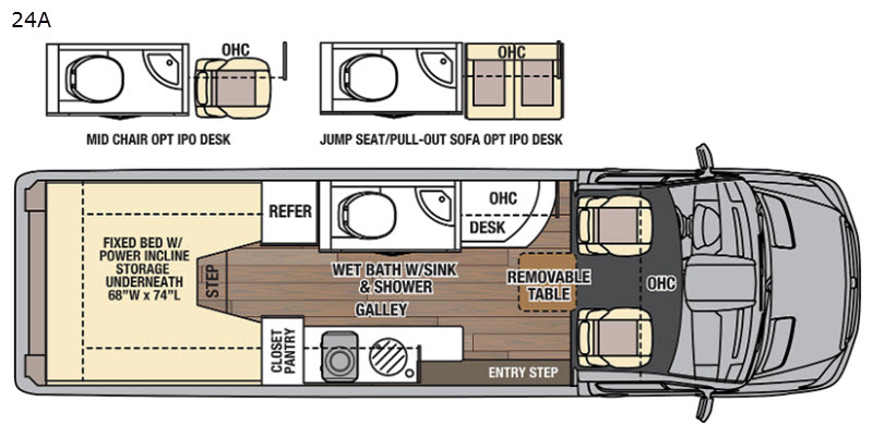 You'll love touring the country in this motorhome that features everything you need while you are away from home. When you arrive at your destination, prepare lunch on the cooktop for a warm meal, and the removable table provides a place to enjoy your meal together. Head outside to stretch your legs and when you return, you can easily clean up in the wet bath. This model includes a fixed bed with power incline and under-bed storage for your luggage or tools. You might like to add a mid-chair option or jump seat/pull-out sofa option in place of the desk, the choice is yours.