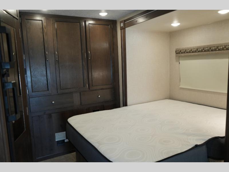 Private Rear Bedroom – Features a walk-around queen bed with premium mattress, storage cabinets, and soft lighting for a restful retreat.