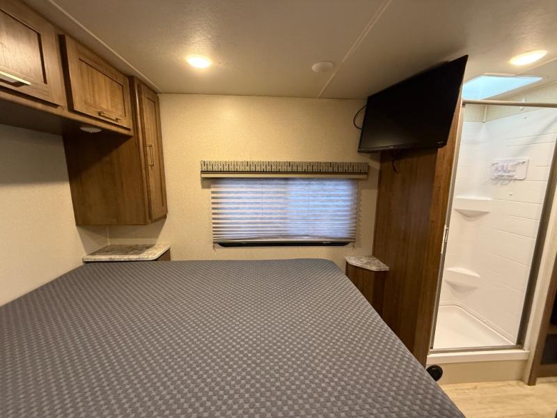 If you have a small family that is ready to hit the open road in comfort then this Coachmen Pursuit Precision 27XPS is for you! It features a drop down overhead bunk, 63" sofa with storage, and a rear queen bed with wardrobes on either side and overhead cabinets above, plus there is even a 72" x 42" booth dinette for you to enjoy your meals at, play a card game, and even transform into an extra sleeping space. If you're not one to play card games then you can relax on the sofa while watching your favorite movie on the 32" LED TV. You will also enjoy the split bath, one person can freshen up in the 24" x 32" shower while another person washes up for dinner.