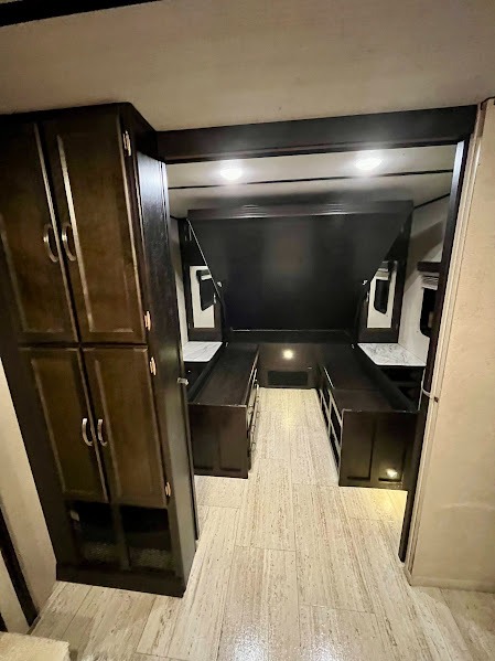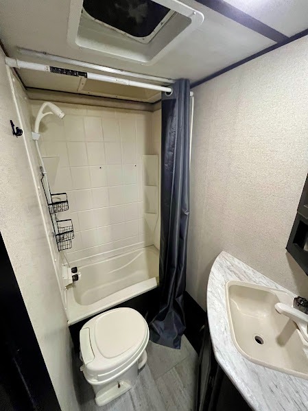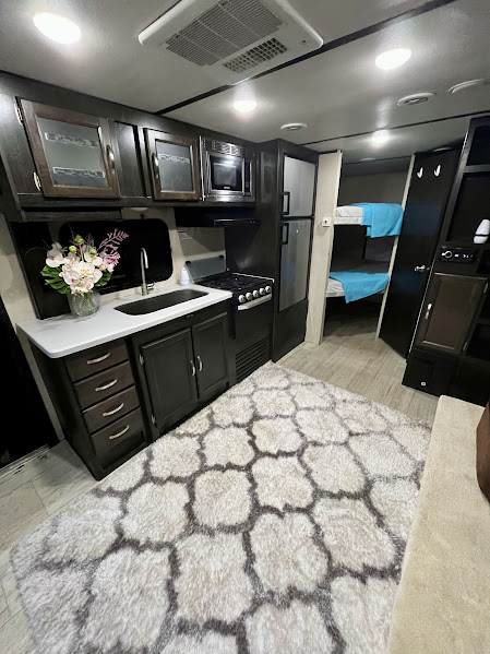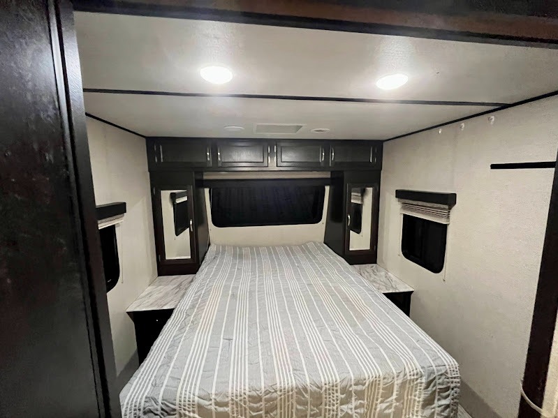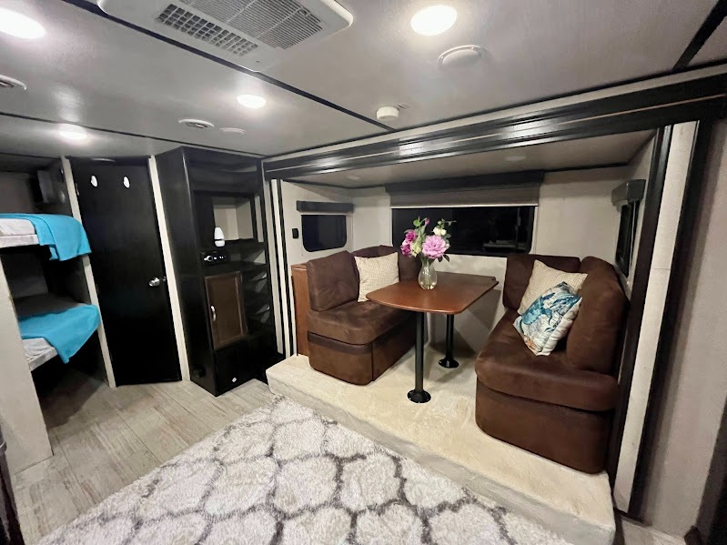 Wherever you choose to camp, you can be sure to make memories in this travel trailer. The kids will love playing outside all day and climbing into the double bunk beds at night. Of course, the rear corner bath will come in handy to clean up before bed. Easily prepare eggs and bacon on the three-burner cooktop or use the exterior camp kitchen if the weather is nice. Your crew can enjoy the meal at the picnic table or around the U-shaped dinette inside. Mom and dad are sure to love the front private bedroom with its dual sliding doors and a queen bed with Max Bed Storage. This model also includes an exterior pass-through storage for yard games or fishing poles!